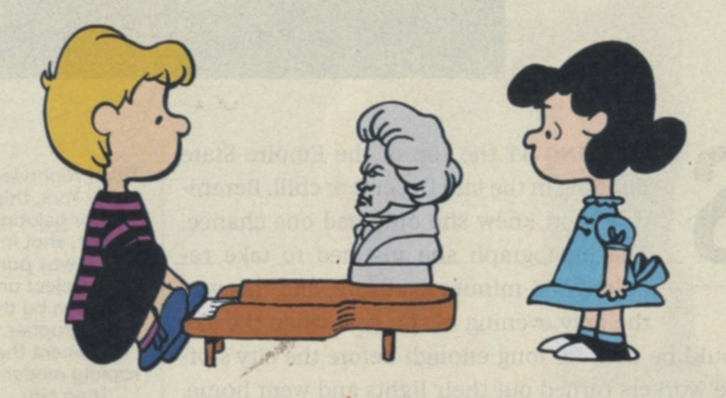 Schroeder nimbly performs Beethoven while Lucy looks on. Image by Allstar Picture Library Limited / Alamy; © 1969 peanuts worldwide LLC, Dist by uclick via Smithsonian.