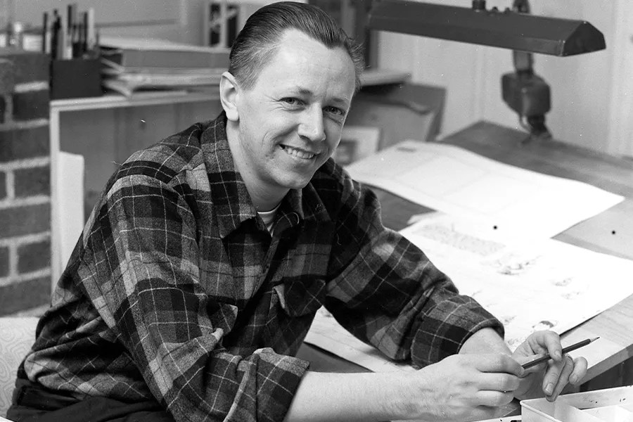Charles Monroe “Sparky” Schulz, 1922–2000, American cartoonist in his studio, c. 1954. Image from the Charles M. Schulz Museum by Michael Myers via Smithsonian.