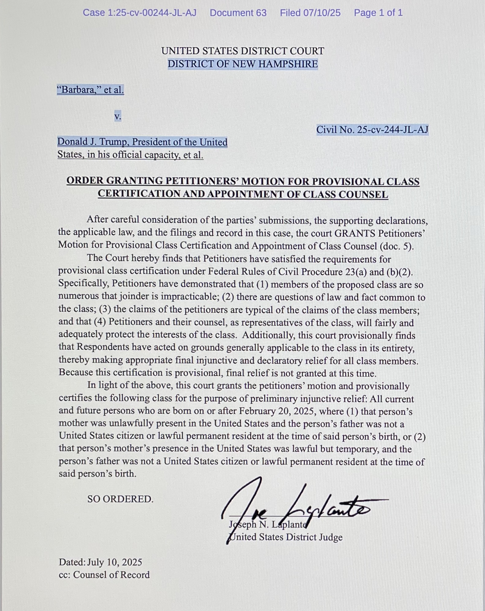 Note that Trump’s Executive Order specifically attacks those “born within the United States after 30 days from the date of this order.” Thus, Judge Laplante’s class-action focus.