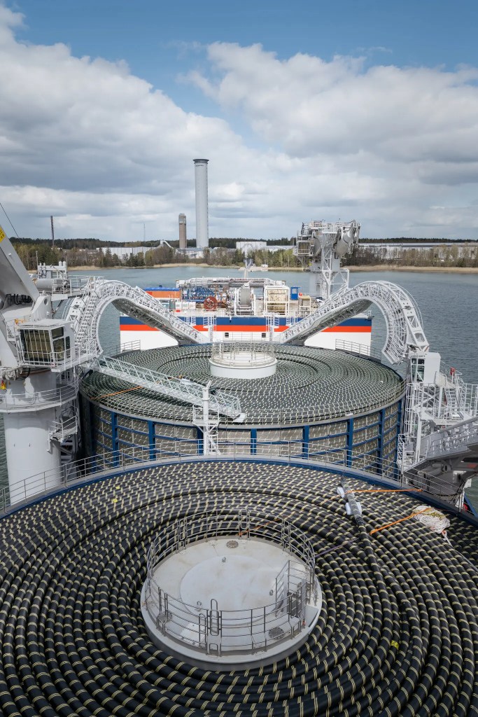 Above, spools of cable awaiting shipboard. Below, loaded in readiness for cable installation.