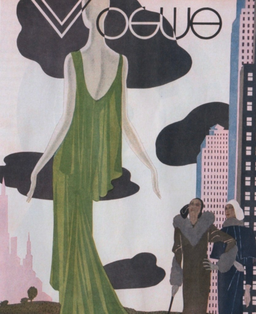 Vogue cover by Pierre Mourgue, 1930. “This example from 1930 exudes elegance, shows off the latest fashions, and references the modern skyscrapers springing up in New York City in that era.”