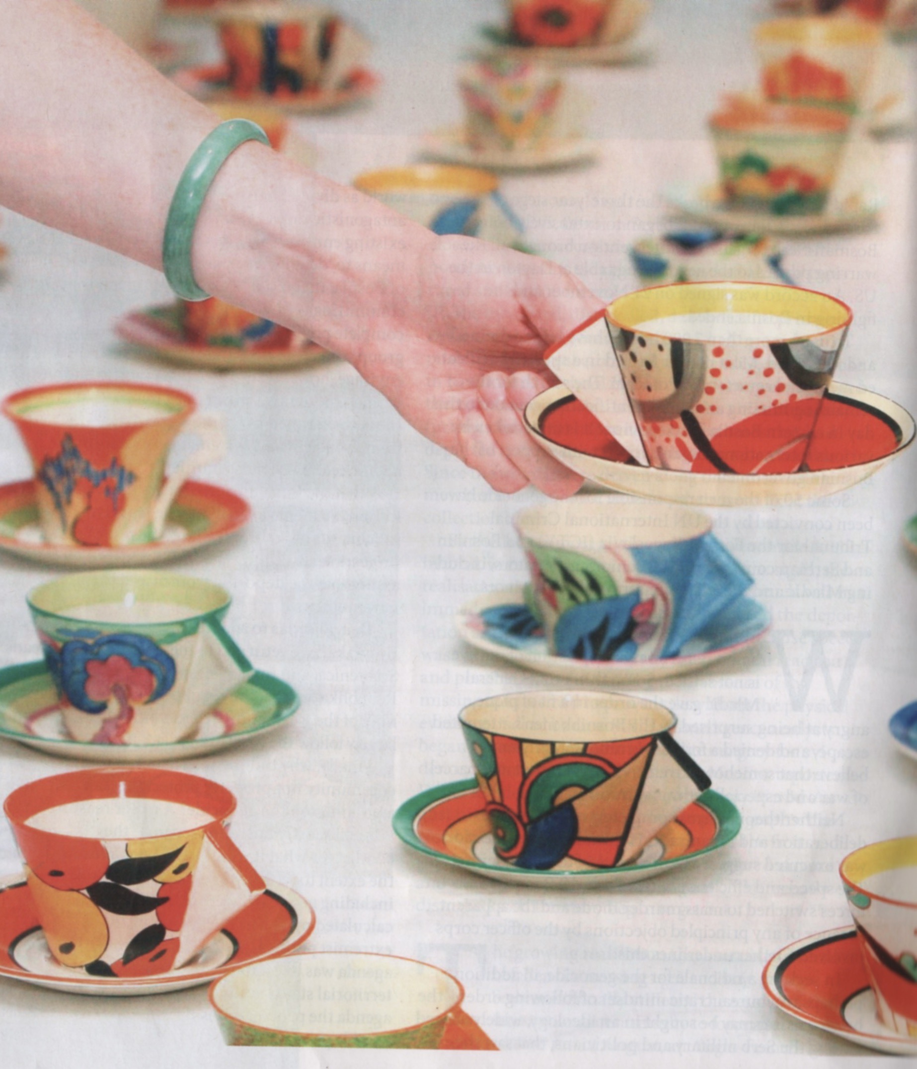 Clarice Cliff teacups. “Pieces designed by Cliff are instantly recognisible for their bold shapes and strong colours.”