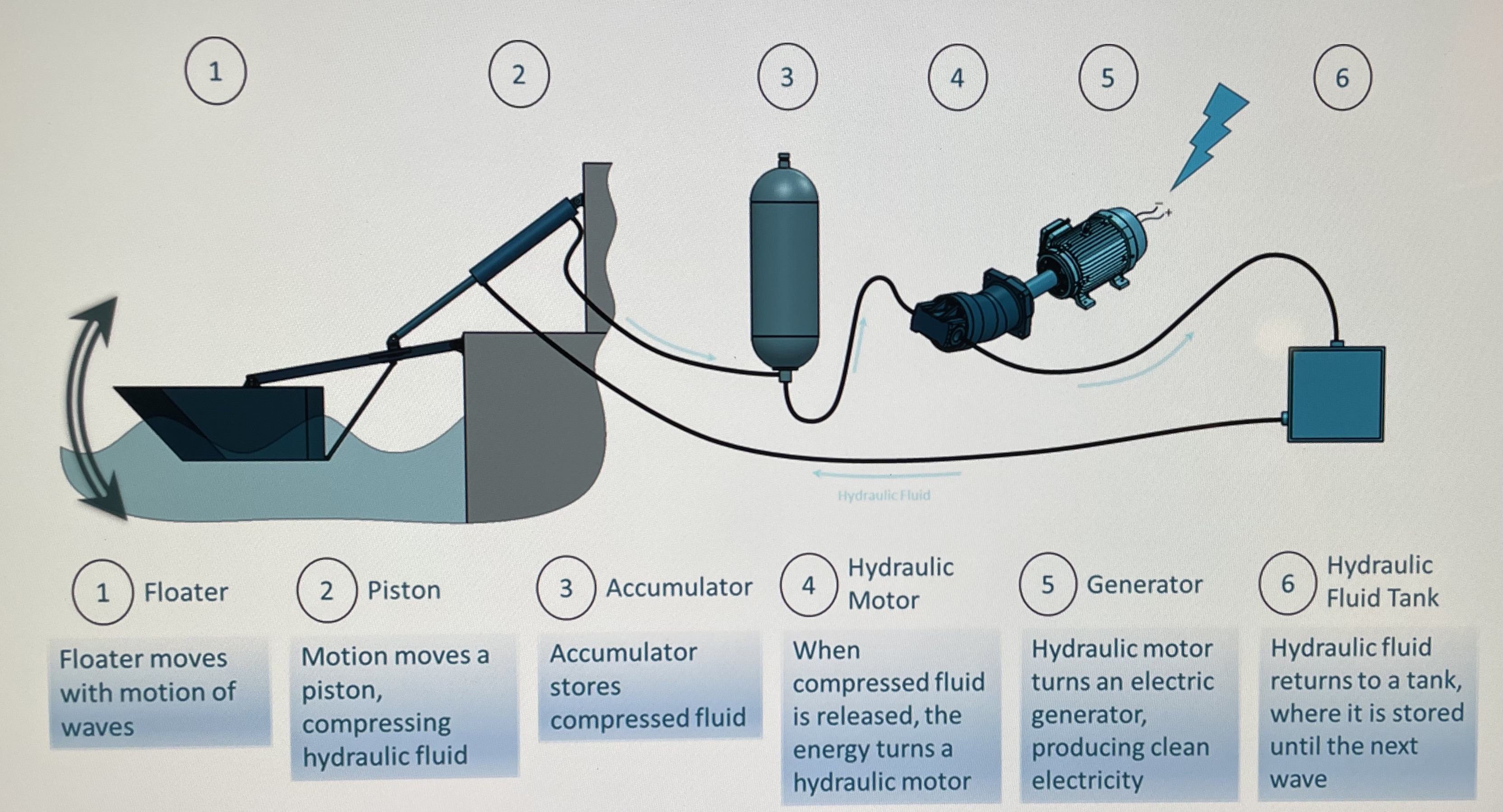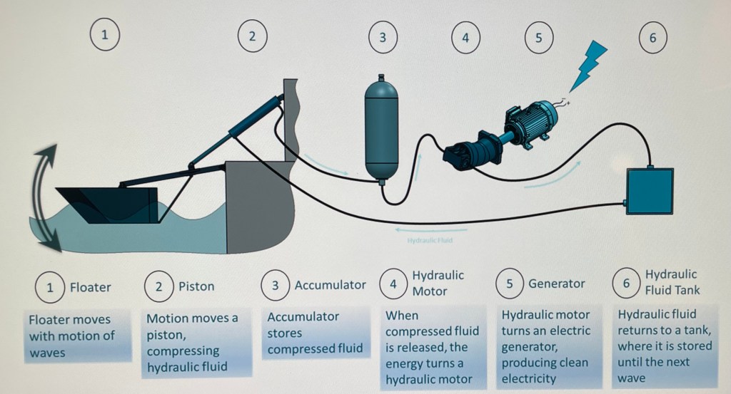 Wave Action to Electricity: “As the small blue floats bob up and down, each pushes a cylinder that sends a biodegradable hydraulic fluid through a system of pipes into storage tanks. Pressure in the tanks builds up. That pressure turns a motor, which turns a generator, producing clean electricity.”