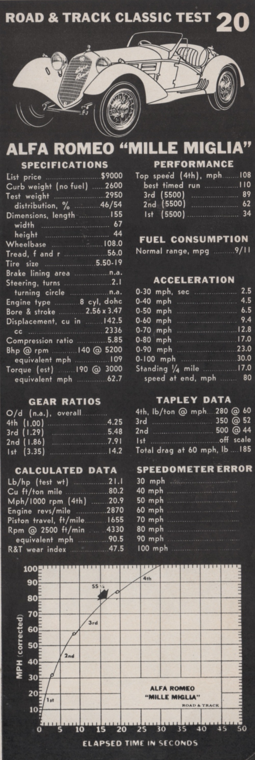 R&T’s Assessment of Performance: “July 1938. Although production of the straight-8 2.3 Alfa Romeo ceased production in the fall of 1933, there are still many enthusiasts of the famous marque who firmly believe that it is much more desirable than the current 2.9.”