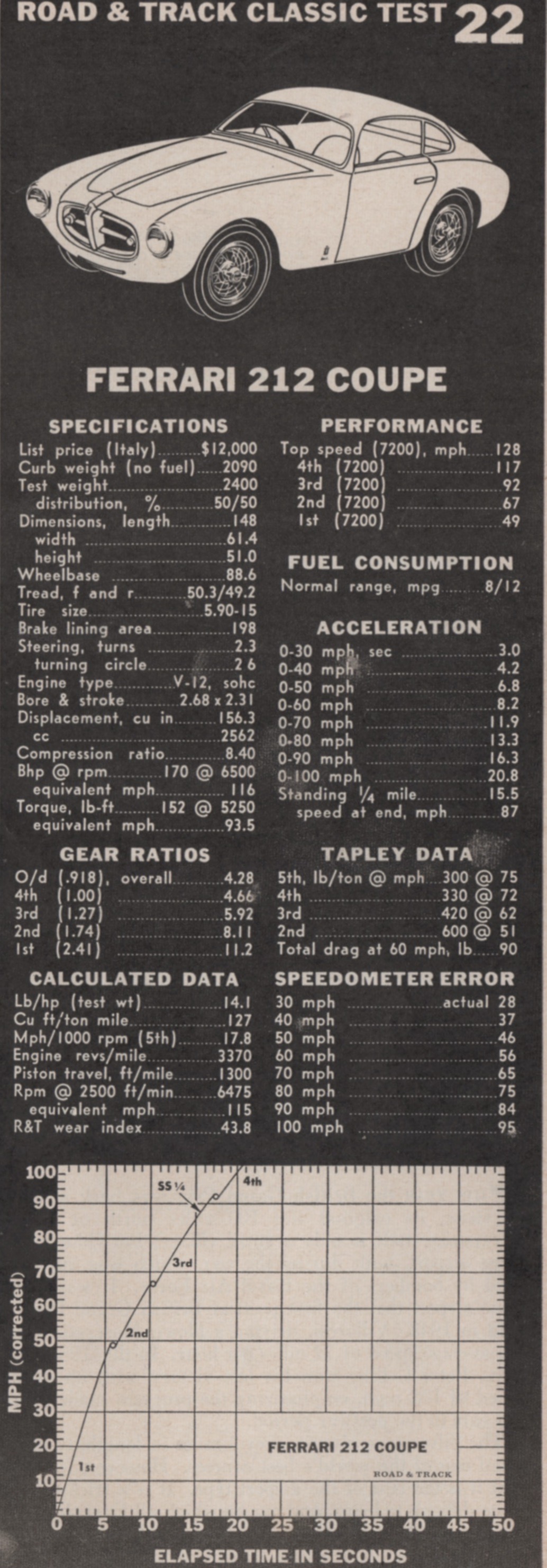 R&T’s Classic Test: “March 1953. The first Ferrari road test published by Road & Track appeared in November 1952; it was a Type 212 with roadster body by Touring, owned by Phil Hill. This test car is very similar, but has a heavier and more streamlined body. Ferrari calls the chassis the Type 212 ‘Tuboscocca.’ ” (Google Translate: “tube body.”)