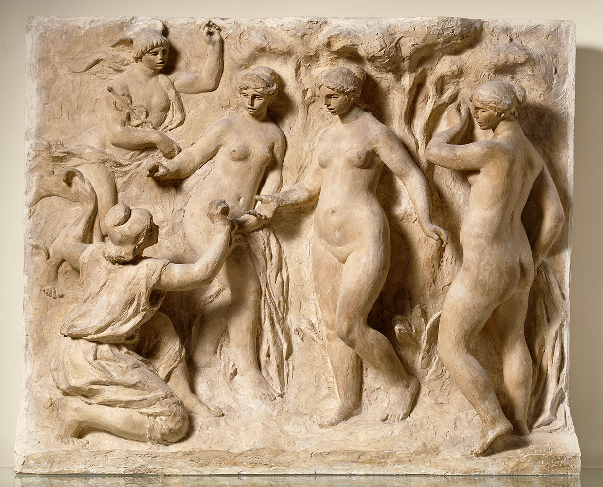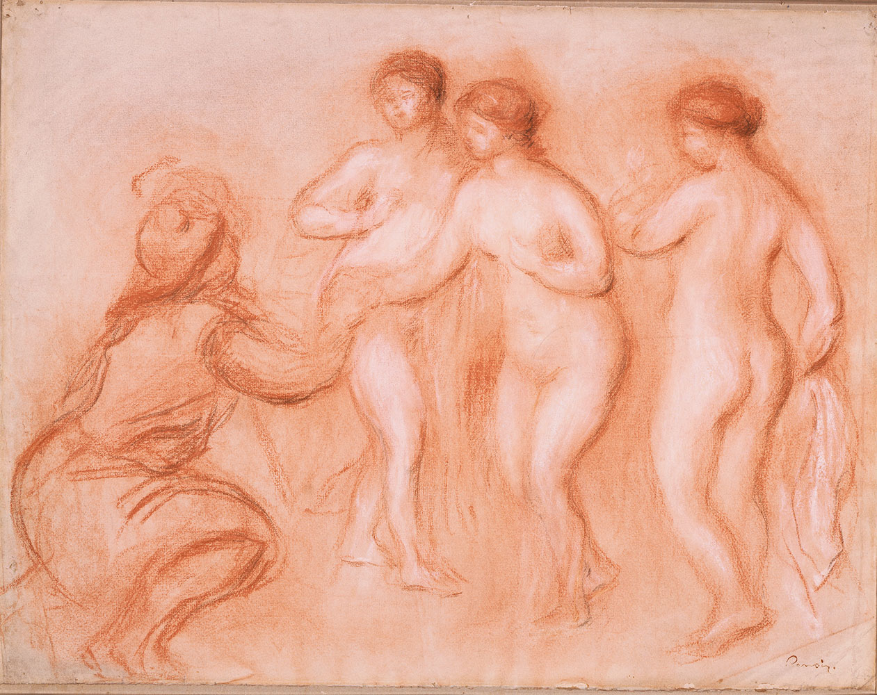 Study for “The Judgment of Paris,” c. 1908. Black, red, and white chalk. Three-dimensional art can evolve from two-dimensional planning. Renoir composed this study in 1908 for The Judgement of Paris, in preparation for the patinated plaster work completed by Renoir and Richard Guino in 1914 and residing in Musée d-Orsay.