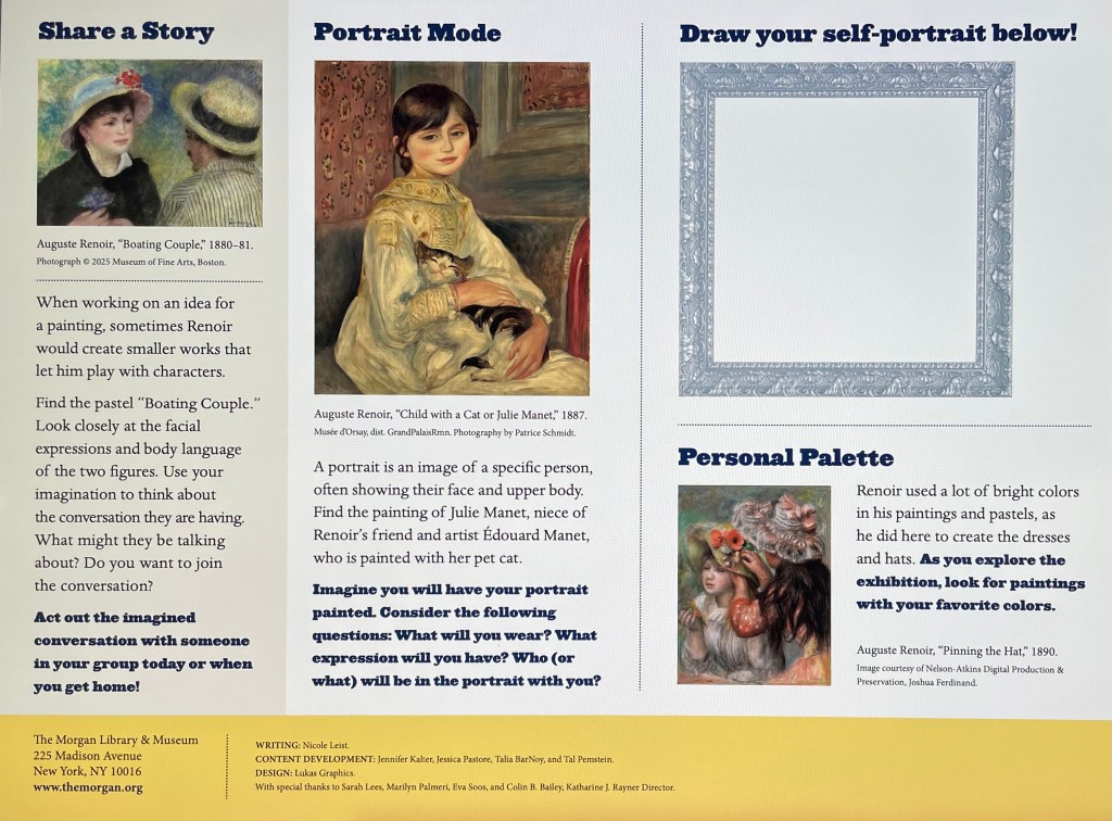 THE MORGAN LIBRARY & MUSEUM, 225 Madison Avenue at 36th Street, is a continent away from me, but through electronic wizardry and the Morgan’s kindness, I am able to share these tidbits gleaned from its invitation to “Renoir Drawings,” an exhibit running from October 17, 2025, through February 8, 2026. Together with a selection of Renoir’s works and a downloadable Renoir Drawings Family Guide, there’s an introductory Audio Guide (with Transcription) by Colin B. Bailey, Director of the Morgan Library and Museum.