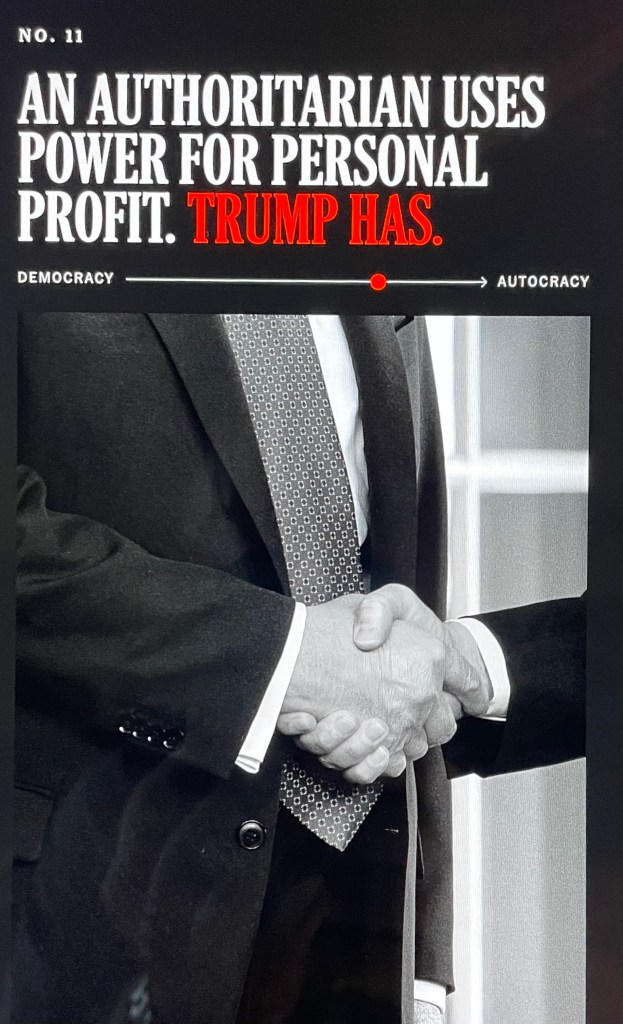 The Board cites “the comically petty (like charging the Secret Service up to $1,200 per night for rooms at his hotels) to the shamelessly greedy (like the $40 million that Amazon paid for the rights to a Melania Trump documentary or his recent demand that the government pay him $230 million because he was investigated for breaking the law).”