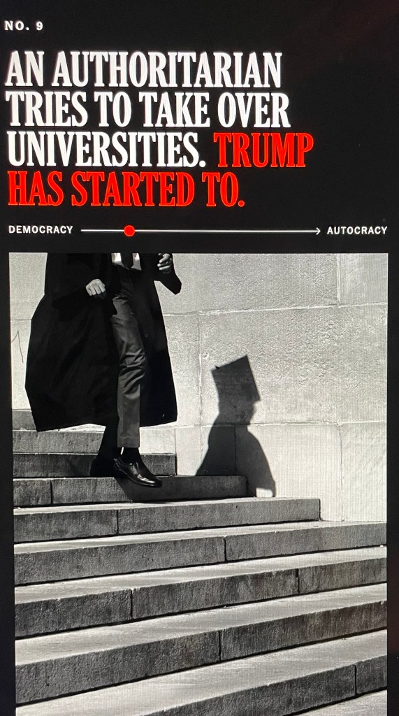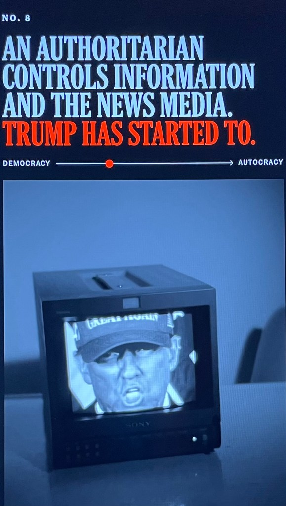 Consider the LRB firing, public radio and television defunding, climate-change data-collecton reduction, and Trump’s mobster extortion of ABC, Paramount (which owns CBS), YouTube, and Meta to settle baseless claims, and his lawsuits against The New York Times and The Wall Street Journal.