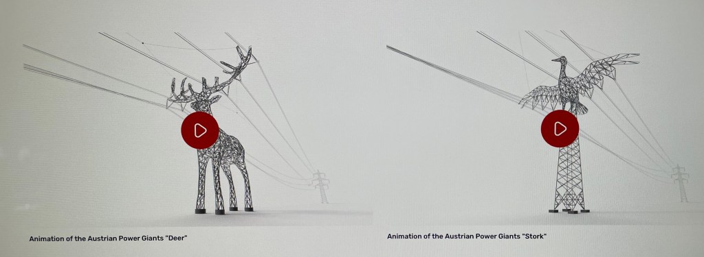 Animals Honoring Austrian Regions. “For example,” APG describes, “the stork symbolizes Burgenland, where these birds return each year, while the stag embodies Lower Austria, reflecting the region’s forested Alpine foothills.” At this point, it’s only a design concept, but if it procedes seven other Austrian federal states would receive iconic animals. The two transmission towers have been pre-tested statically and electrotechnically to verify their technical feasibility.