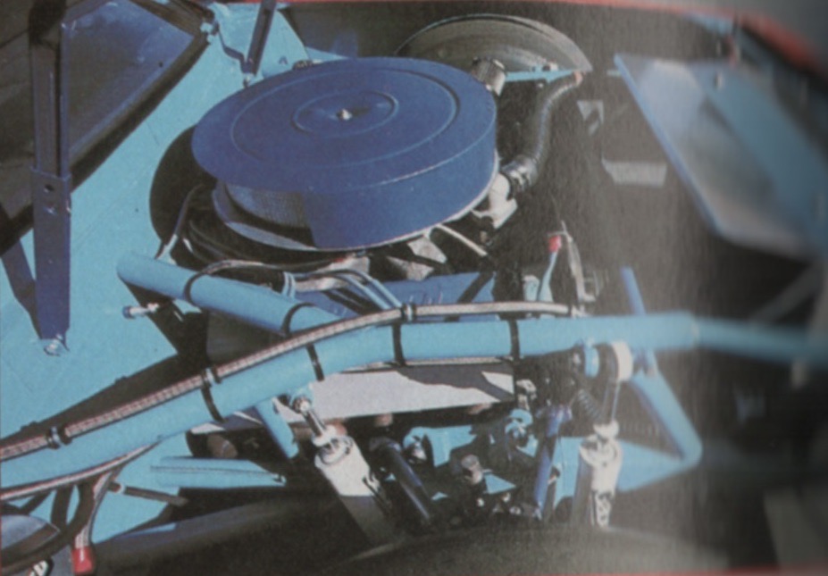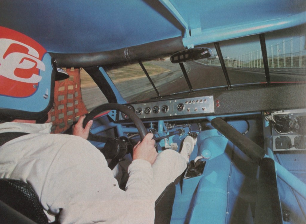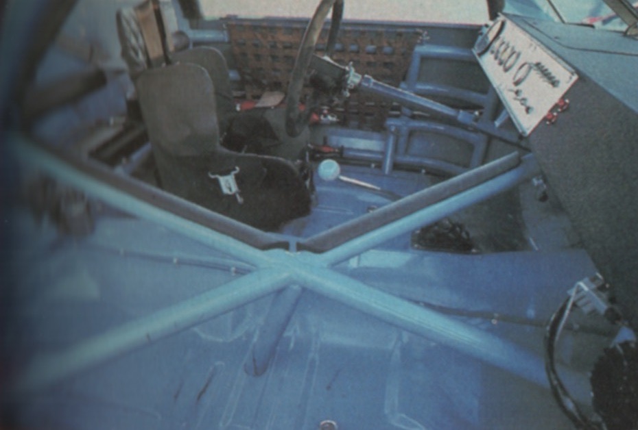 A Racer Interior. “The exterior of this ‘stock car’ may pass for stock, but its interior is racer, pure and simple. There’s a fabricated dashboard carrying the necessary gauges and switches along with the 2-way radio customary these days, a high-sided form-fitting seat angled sharply to the left, a longish shifter growing out of the Petty-blue-painted floor pan, huge pedals with corrugated faces and a thick-rimmed removable steering wheel. Surrounding all this is a roll cage whose robustness accounts for the frequency with which NASCAR drivers tend to emerge unscathed from occasional 180-mph contretemps.”