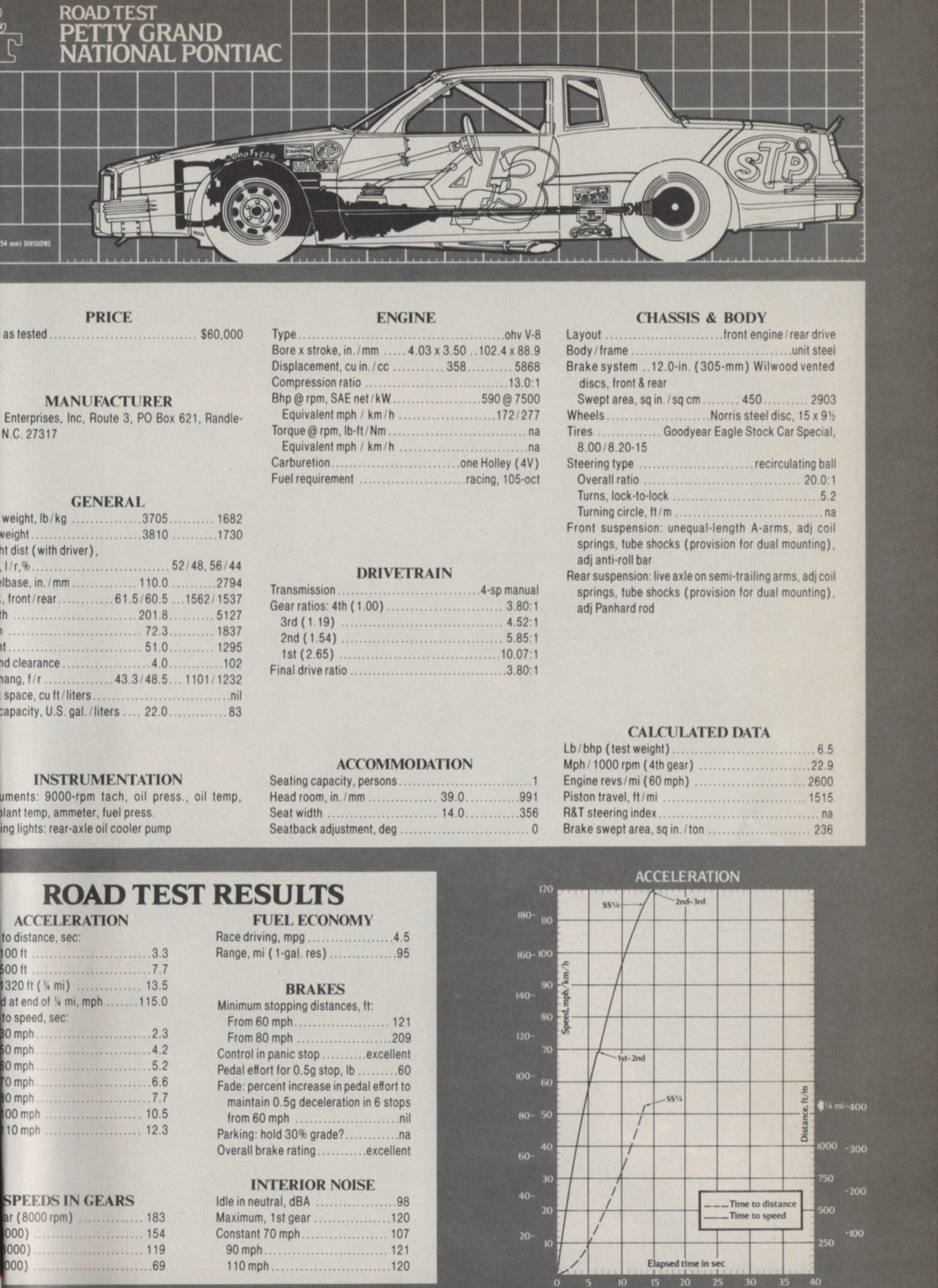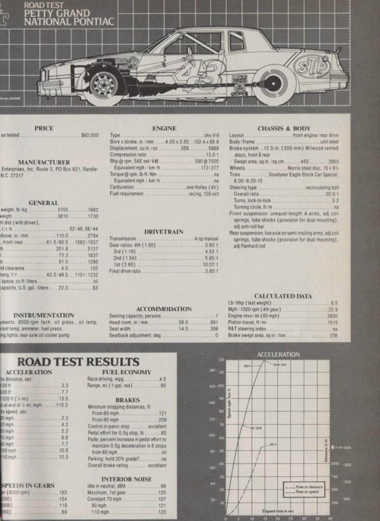 The Petty Grand National Pontiac. Alas, cropped because of the thickness of R&T’s 1982 bound volume; ditto for the Data Panel. This and following images from R&T, April 1982.