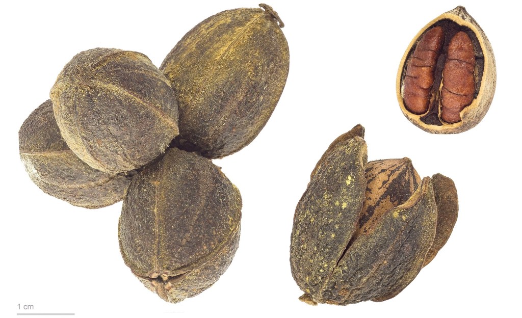 Above, immature pecan fruits. Image by SnickeringBear via Wikipedia. Below, Carya illinoinensis. Image from Muséume de Toulouse via Wikipedia.