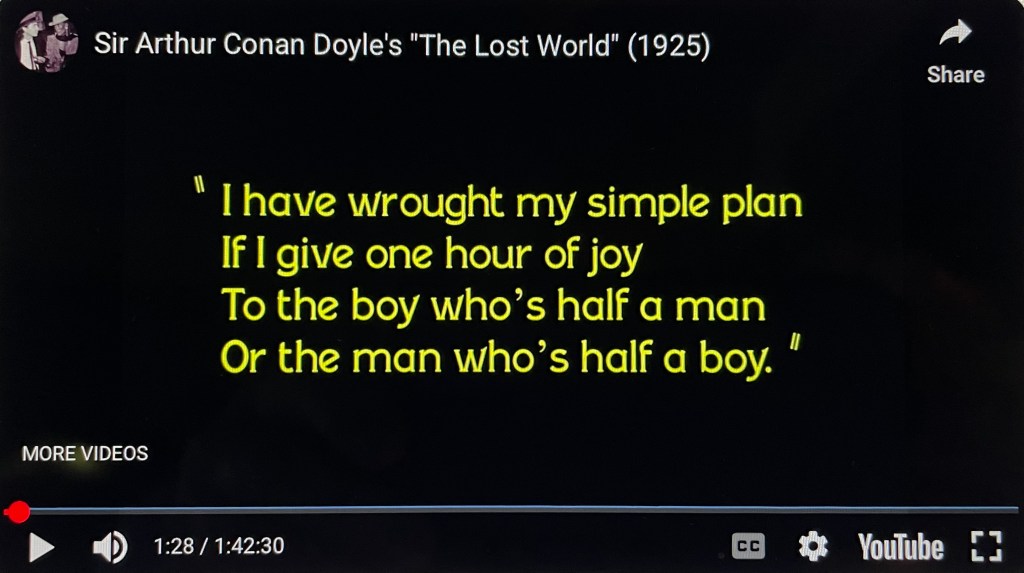 Sir Arthur Conan Doyle. Below, his novelistic aspiration. By the way, such silent-flick blurbs are known as “intertitles.”