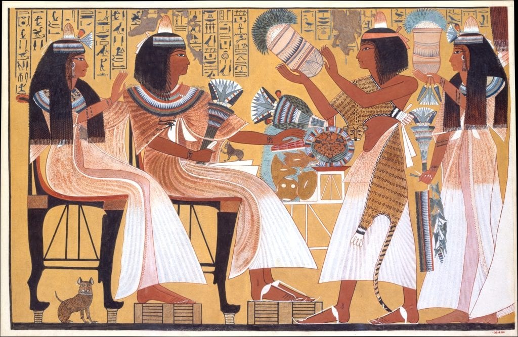 A wall painting from the tomb of Ipuy at Deir el-Medina. Ipuy has a small kitten sitting on his lap whilst a cat sits under his wife’s chair. Image from Nile Magazine via University College London.