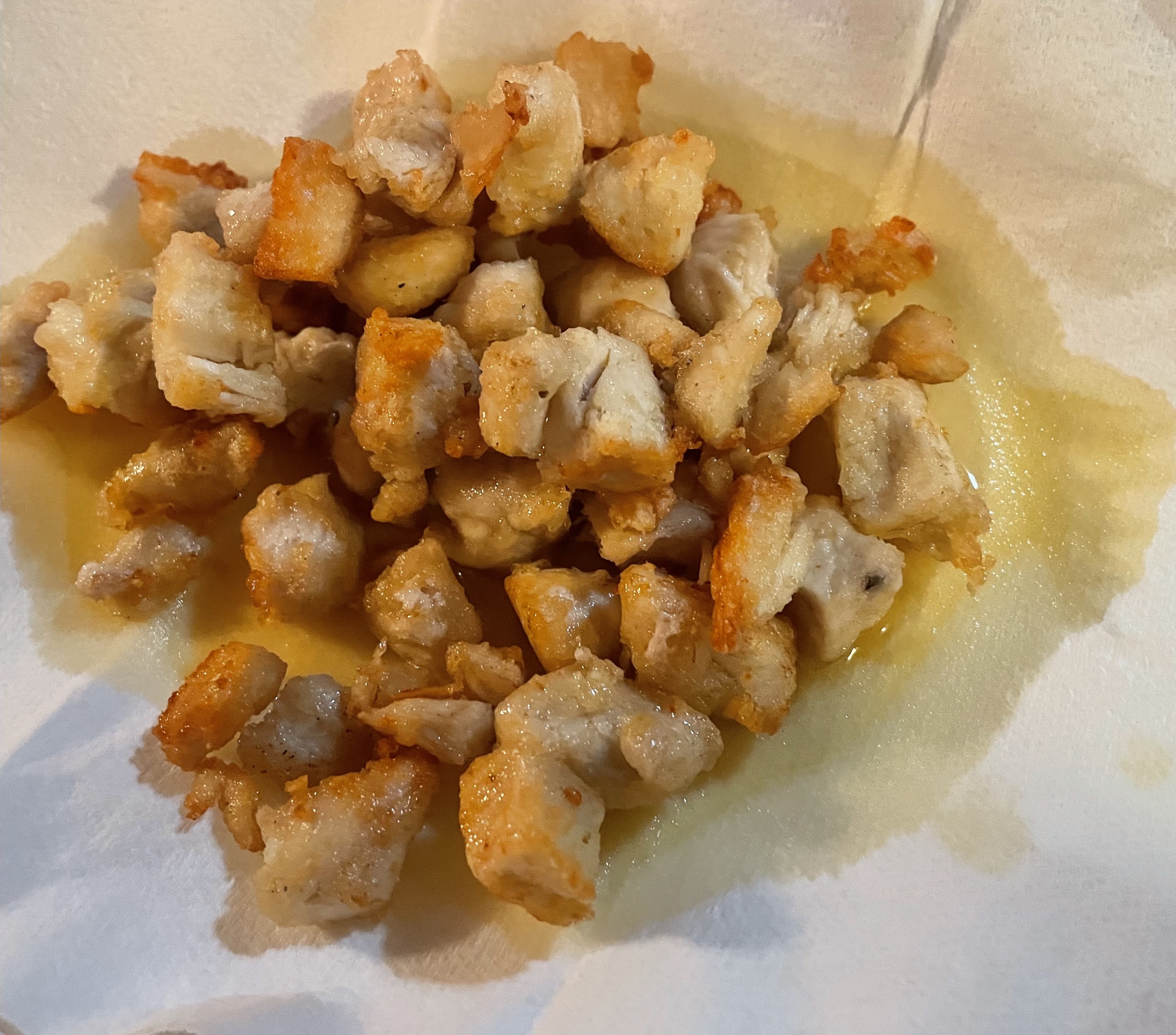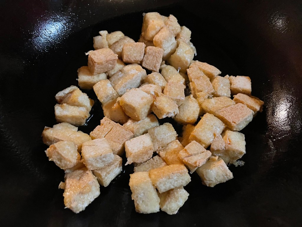 Then comes the tofu, the same wok and oil, the same deal about breaking up pieces and continuing until they’re crisp. Set aside on another paper plate.