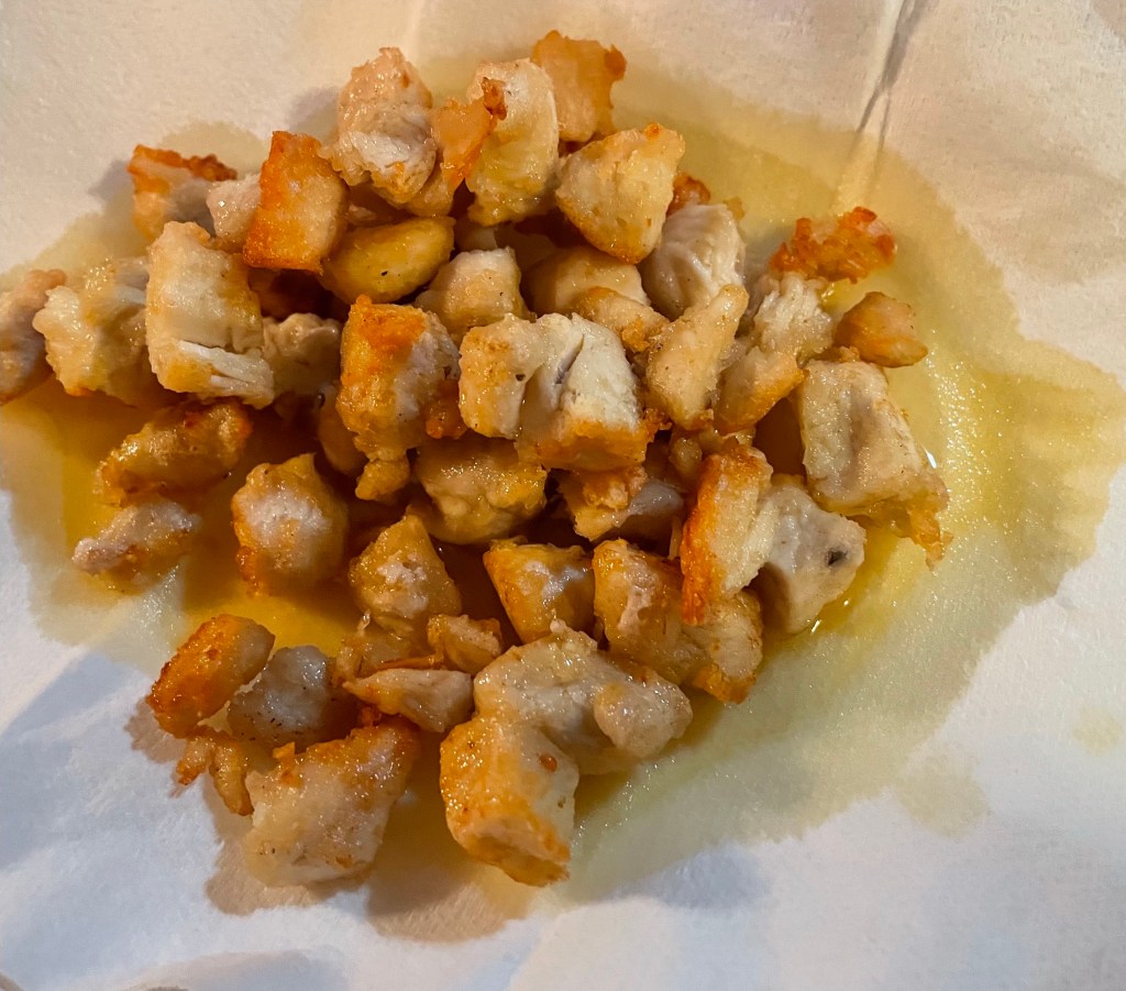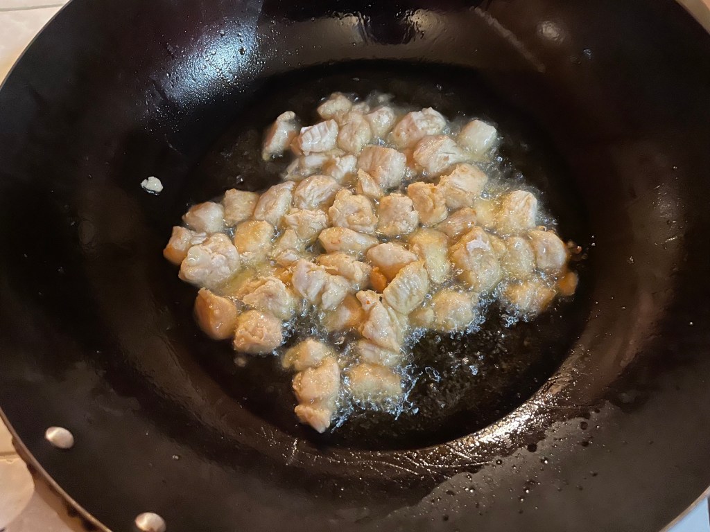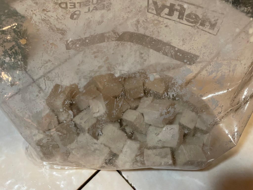 The Baggie Prep. I put the cubed tofu and chicken in separate baggies: the chicken’s with a light toss of flour, the tofu’s with corn starch.