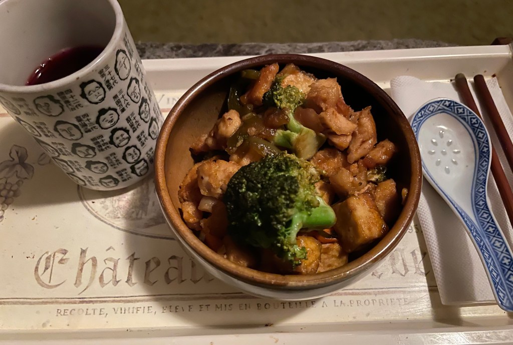 Yum. I enjoy the variety of this stir fry. This time around, it’s chicken, tofu, and veggies in oyster sauce. Next time it might be shrimp and veggies in Thai peanut.