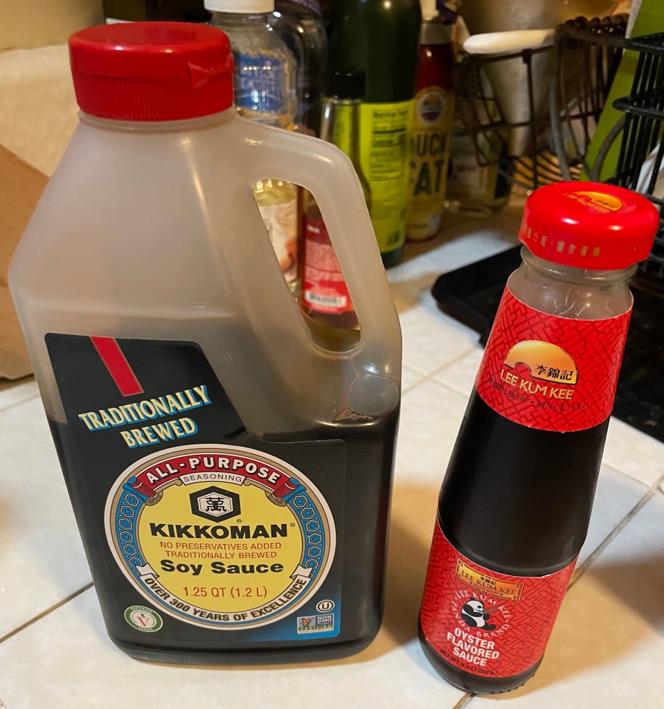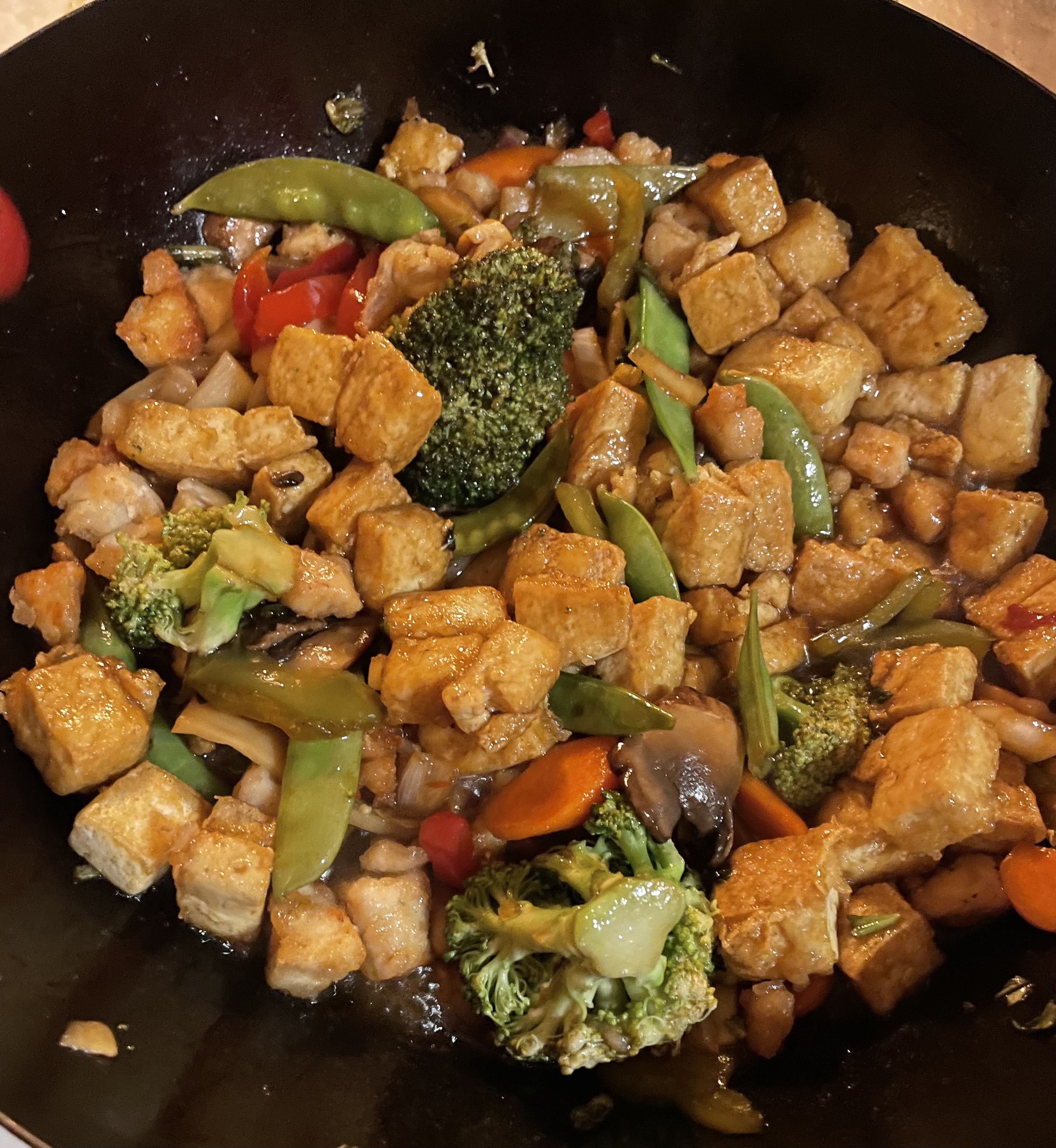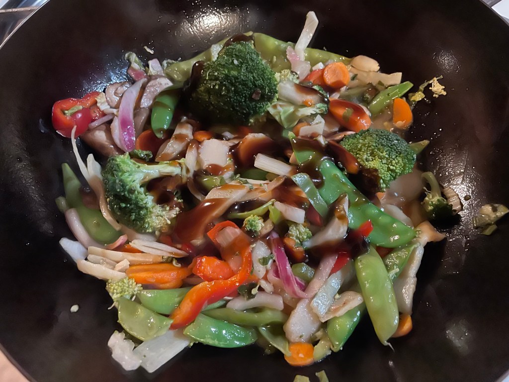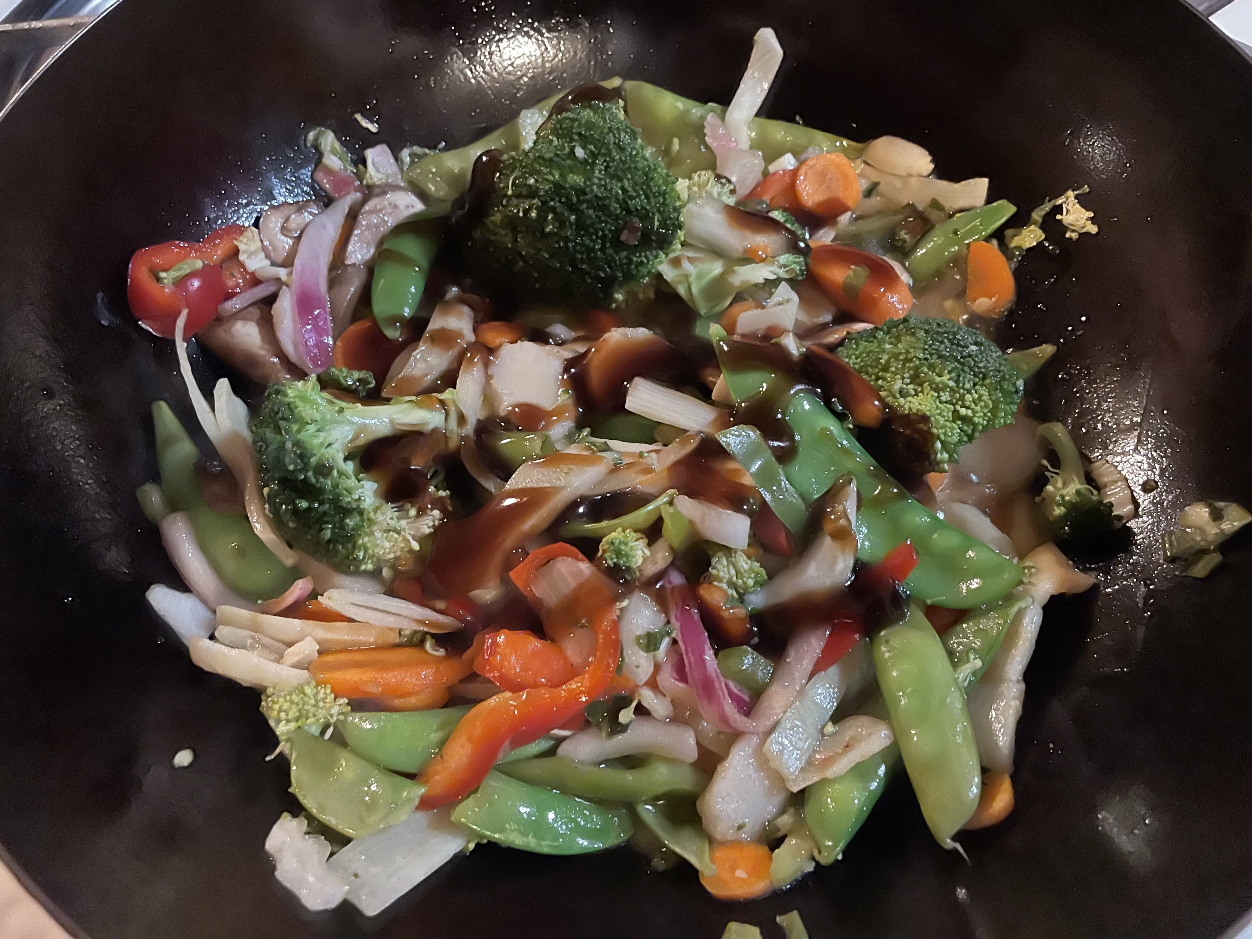 Then come the veggies. Same deal, maybe adding a bit more oil. As they near completion, I add the sauce of choice plus just enough soy sauce to yield the desired consistency.
