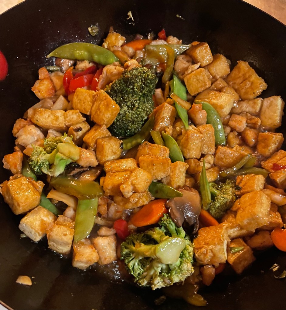Finally, toss in the chicken and tofu. Mix to heat and combine flavors and it’s done.