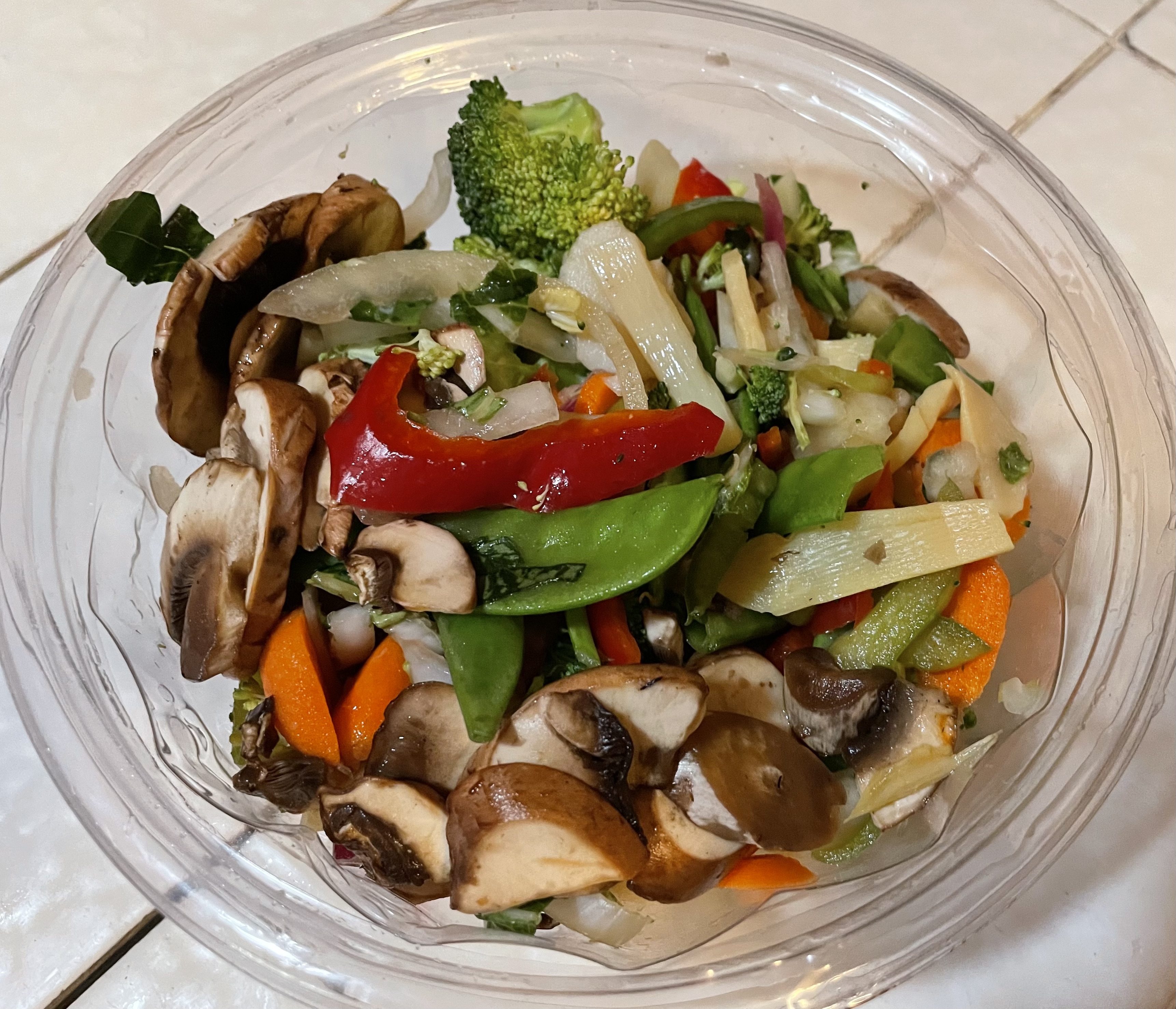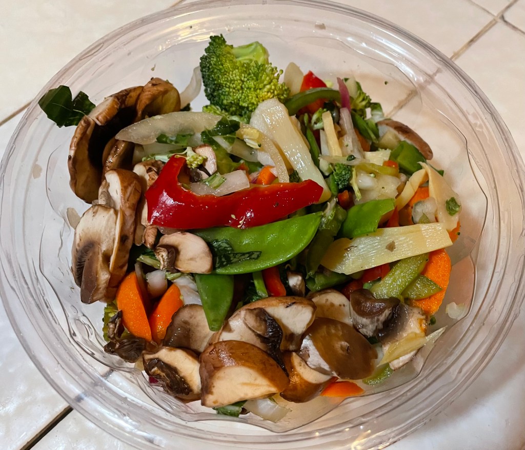 Veggies. Recently I practiced this with my local Trader Joe’s Asian Style Vegetable Stir Fry, a handy mix of mushrooms, sweet peppers, onions, broccoli, snow peas, and other morsels.