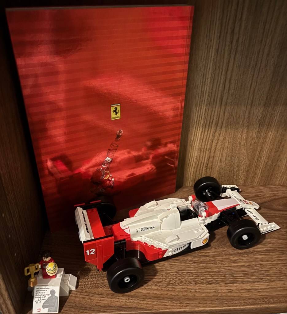 One pic showed Lego appreciations of Ayrton Senna and his championship-winning McLaren MP4/4 posed in front of a coffee table book on Ferraris. (Gee, I wonder if people still have coffee tables? I suspect Carter doesn’t have one in his St. Louis Washington University dorm room.)