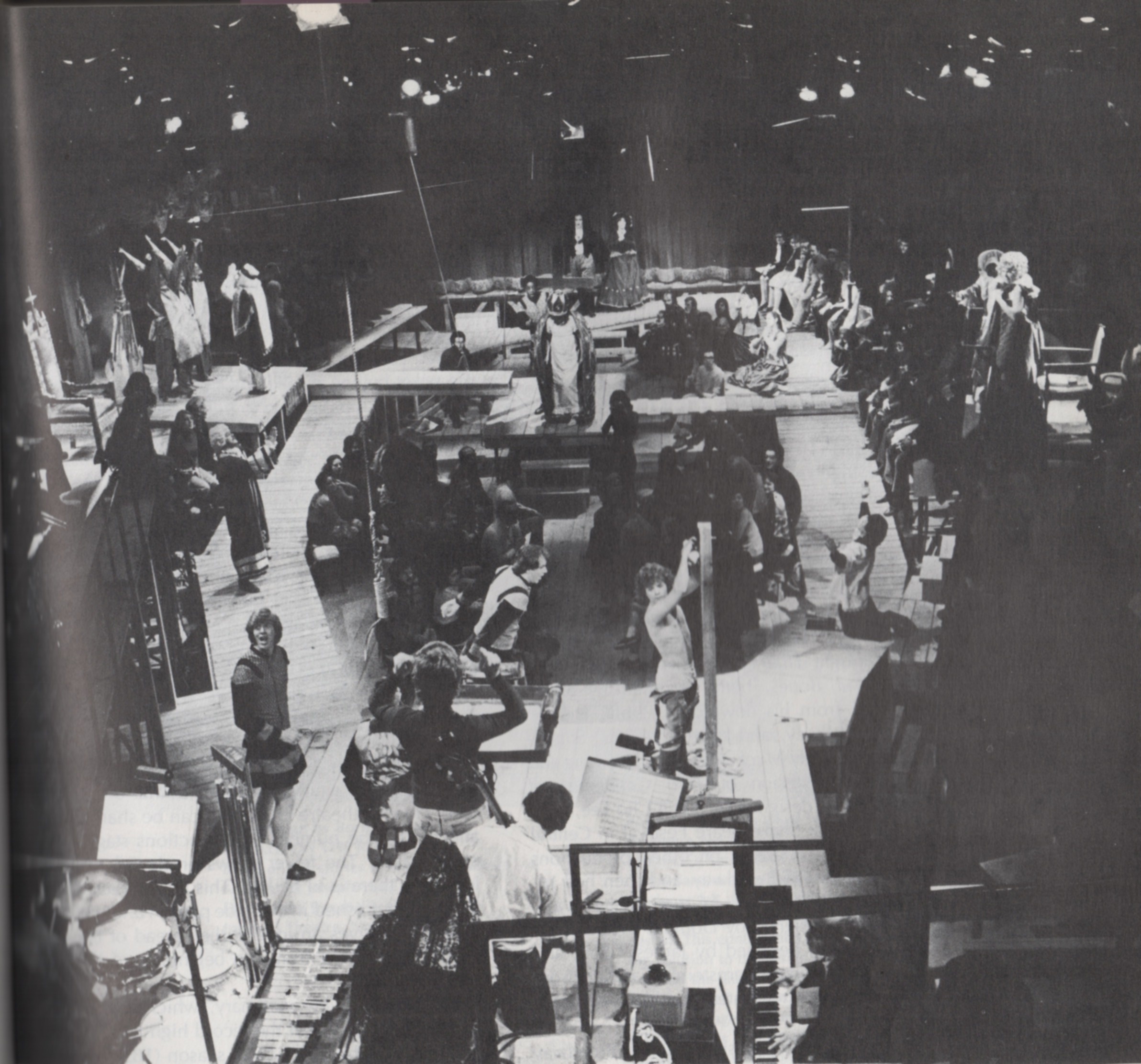 I suspect there was plenty of pouncing in forming Camelot’s intricacies. By contrast, Pecktal observes, “Eugene Lee revamped the Broadway Theatre (a proscenium house) into one large playing arena with spectators seated on benches and stools. Planked platforms and levels form various patterns throughout the house The orchestra is shown in the foreground.”