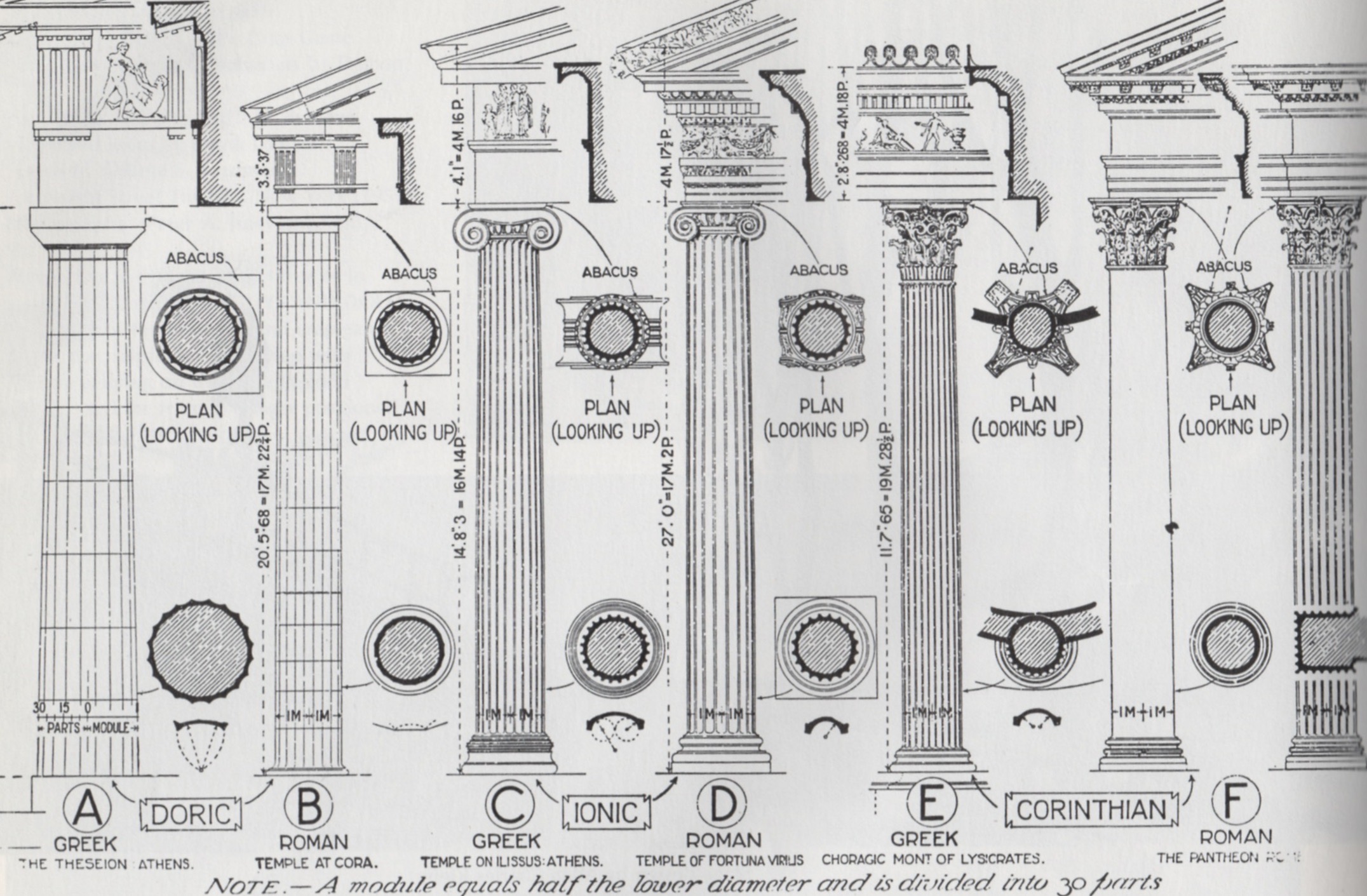 Comparative Greek and Roman Orders of Architecture. This and other images from Designing and Painting for the Theatre.