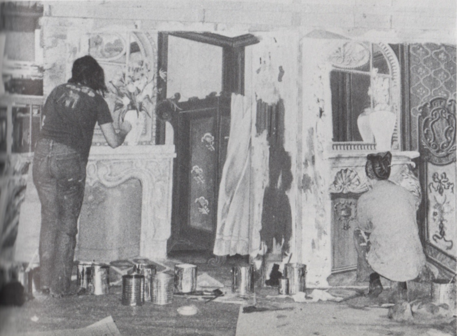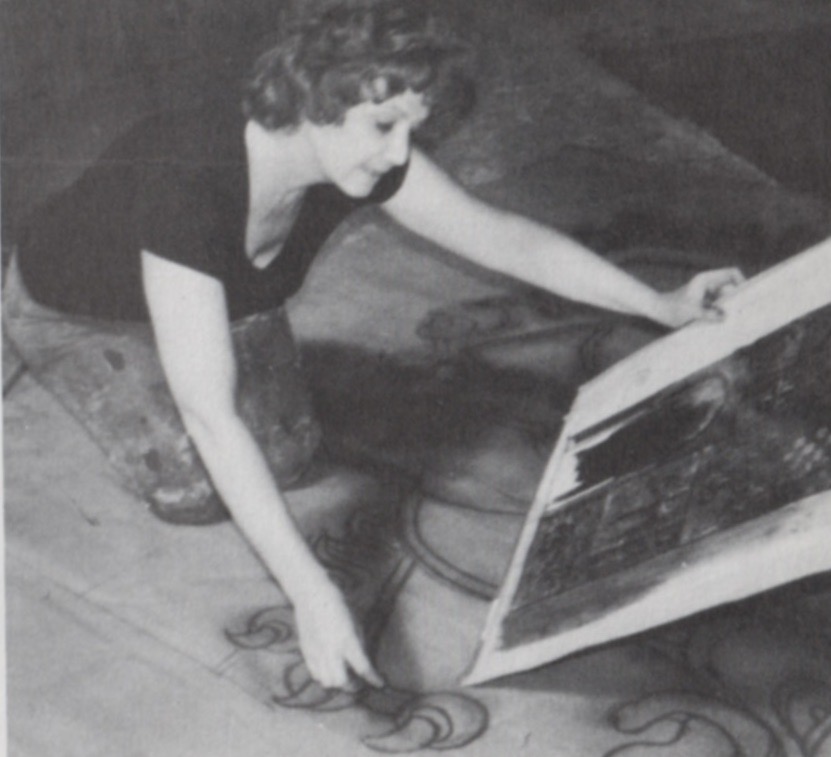 Hope Auerbach and Sue Chapman are “shown working on part of the assigned home project, a 4 foot by 6 foot painting of an interior on muslin. Subjects including in the supplied drawing are brocade wallpaper, marble fireplace with gilt framed mirror above, carved-wooden folding screen with tapestry, metal fire screen, porcelain vase with flowers, fabric draped over screen, and a flagstone hearth.”
