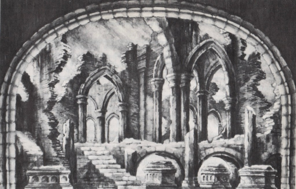 Columns galore. Stage Design for Gaetano Donizetti’s Lucia Di Lammermoor, Act III, Scene 2, by Lynn Pecktal; Teatro Municipal Santiago, Chile, 1970.