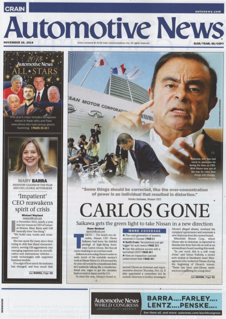 November 26, 2018. We jump to 2018 to recount a lame pun: “Carlos Gone: Saikawa Gets the Green Light To Take Nissan in a New Direction.”