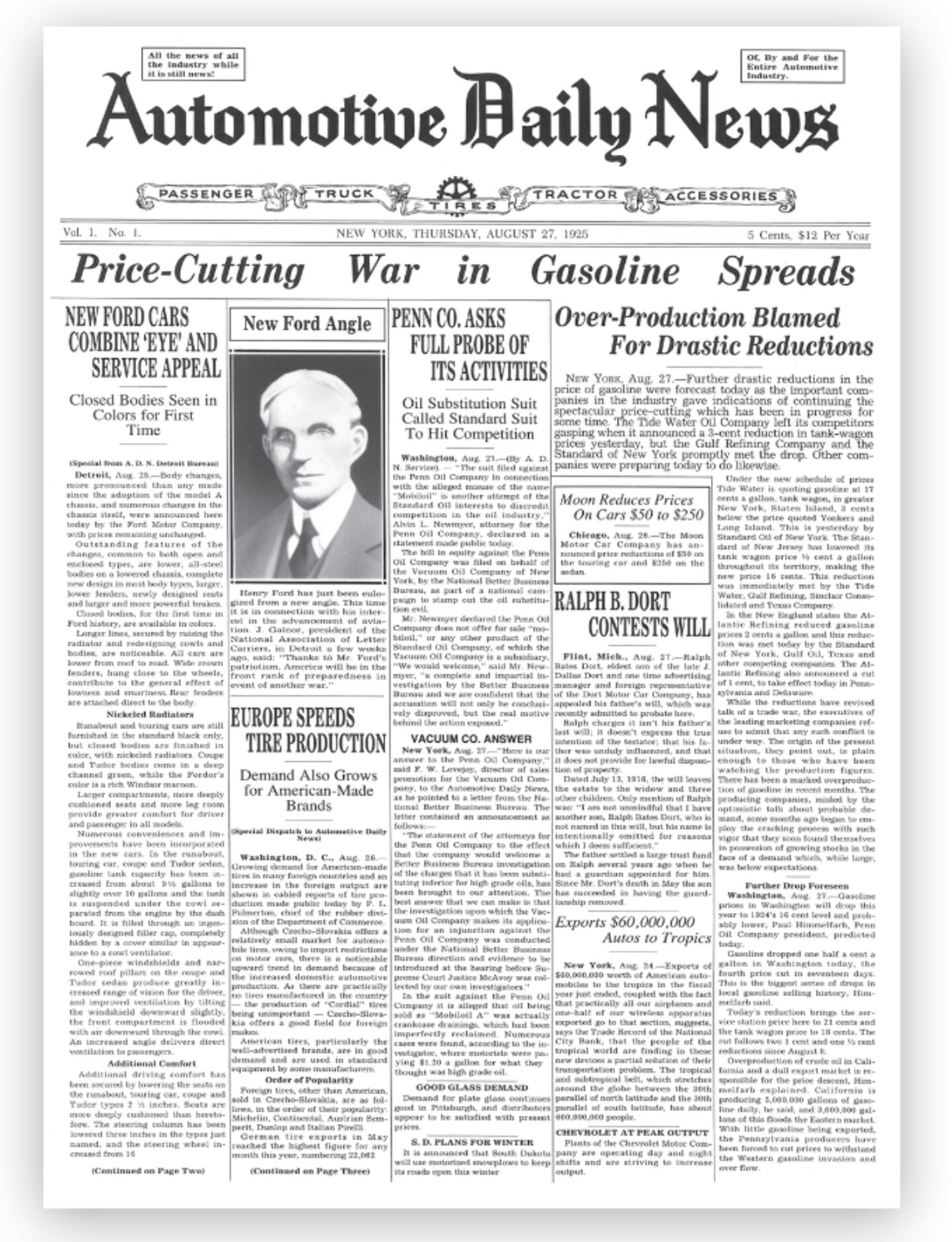 August 27, 1925, Vol. 1. No. 1: “Over-production Blamed For Drastic Reductions. Today’s reduction brings the service station price here to 21 cents [per gallon.]”