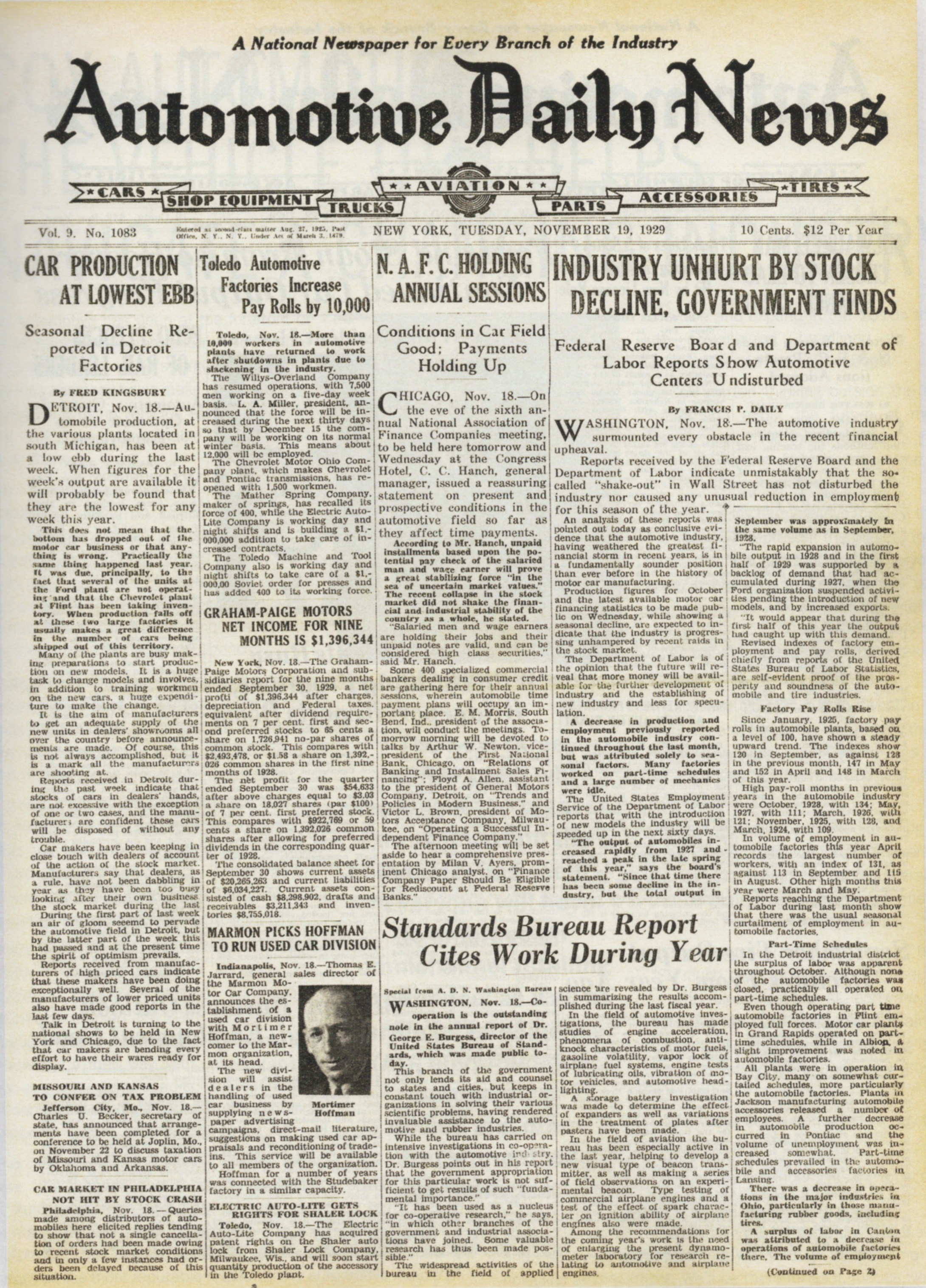 November 19, 1929, Vol. 9. No. 1983. Two headlines suggest instability of the time: “Industry Unhurt By Stock Decline, Government Finds” and “Car Production a Lowest Ebb.”