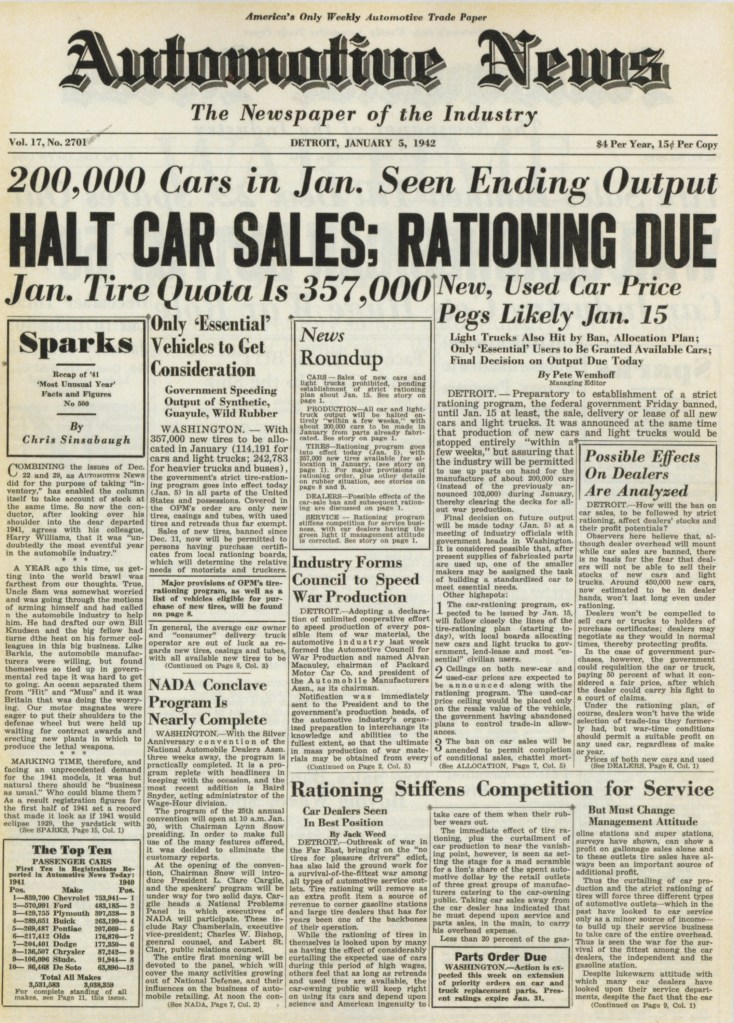 January 5, 1942, Vol. 17, No. 2701. Of course, war changed matters dramatically: “Halt Car Sales; Rationing Due.” “Industry Forms Council To Speed War Production.”