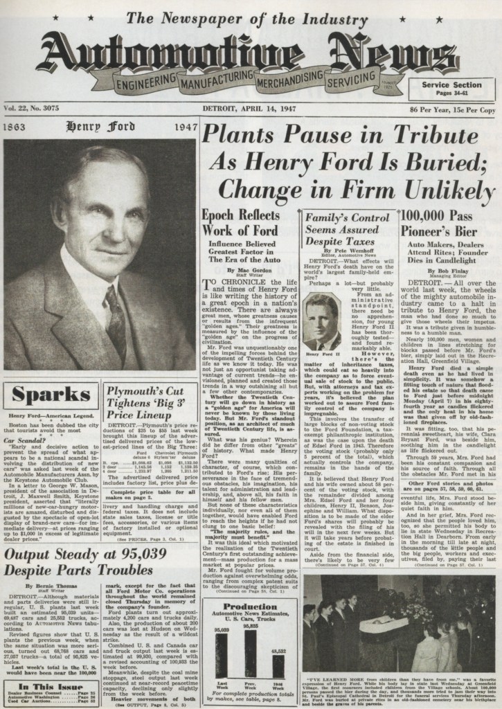 April 14, 1947, Vol. 22, No. 3075. “Plants Pause In Tribute As Henry Ford is Buried; Change in Firm Unlikely.” The now-Detroit based Automotive News recounted, “It was somehow a fitting touch of nature that flooded his estate so that death came to Ford just before midnight Monday (April 7) in his eighty-fourth years as candles flickered and the only heat in his home was that given off by old-fashioned fireplaces.”