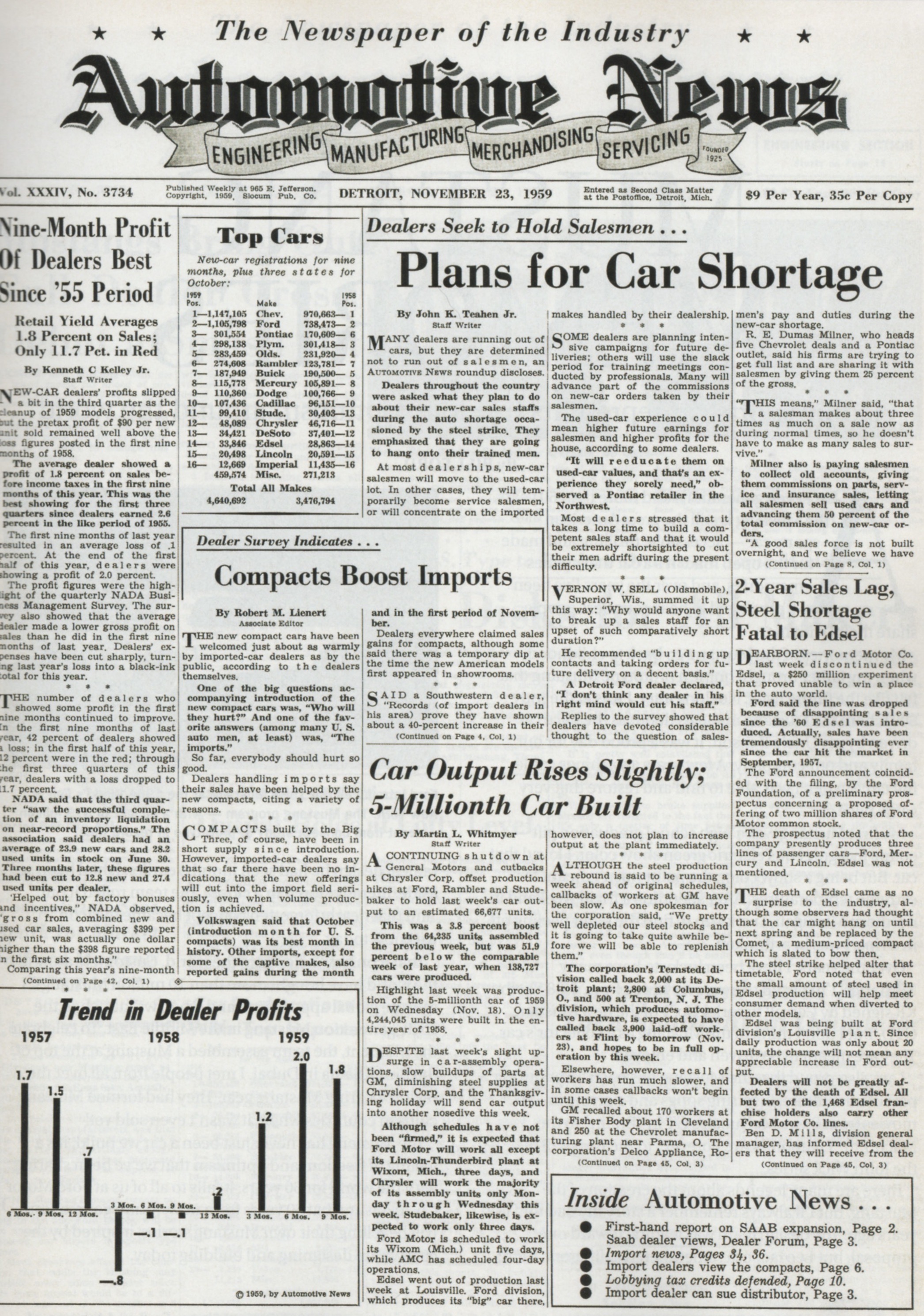 November 23, 1959, Vol. XXXIV, No. 3734. “Compacts Boost Imports.” Automotive News recounted, “One of the big questions accompanying introduction of the new compact cars was ‘Who will they hurt?’ And one of the favorite answers (among many U.S. auto men, at least) was ‘The Imports.’ So far, everybody should hurt so badly.”