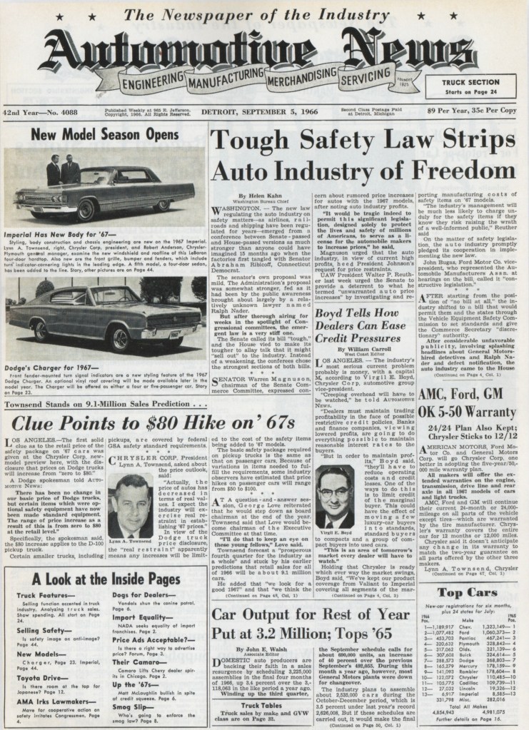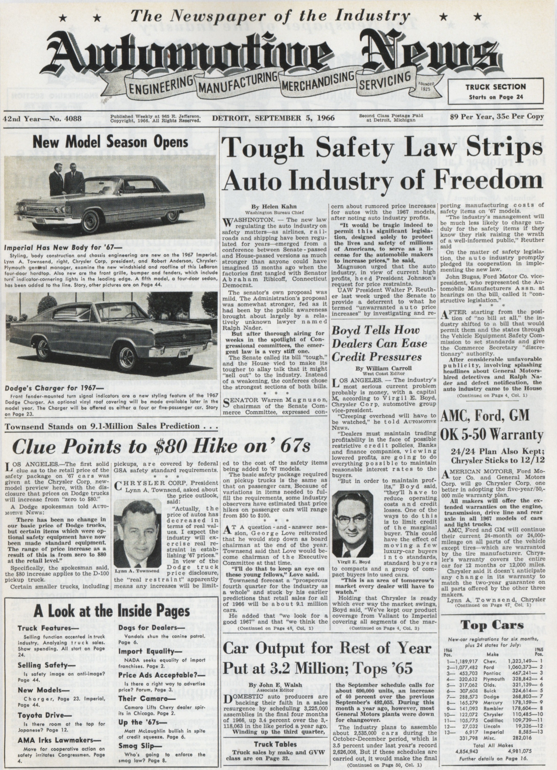 September 5, 1966, 42nd year—No. 4088. “Tough Safety Law Strips Auto Industry of Freedom.”