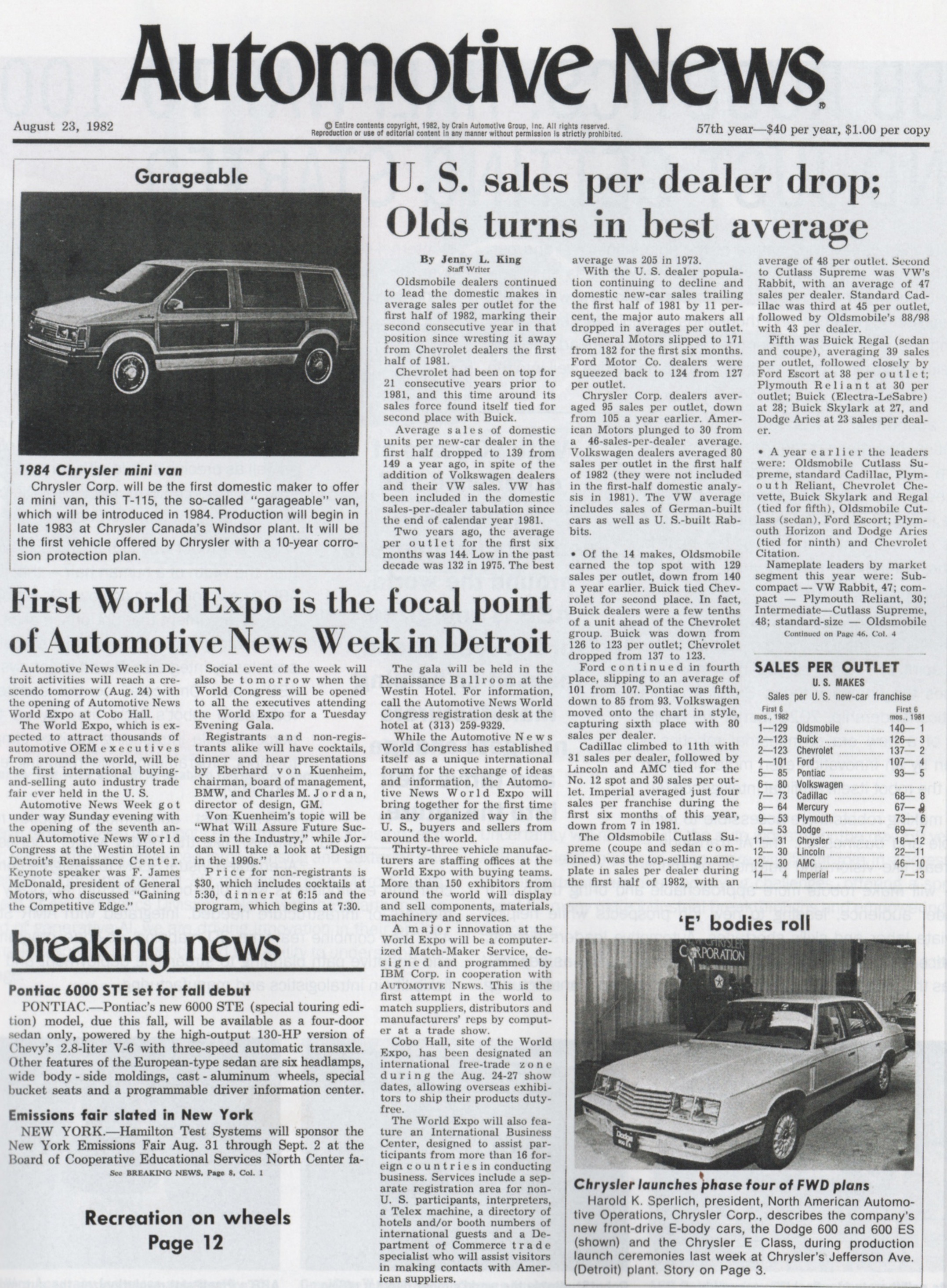 August 23, 1982. In a front-page item labeled “Garageable,” Automotive News announces, “Chrysler Corp. will be the first domestic maker to offer a mini van, this T-115, the so-called ‘garageable’ van, which will be introduced in 1984.”