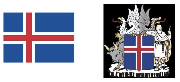 Above, the flag and coat of arms of Greenland. Below, the flag and coat of arms of Iceland.