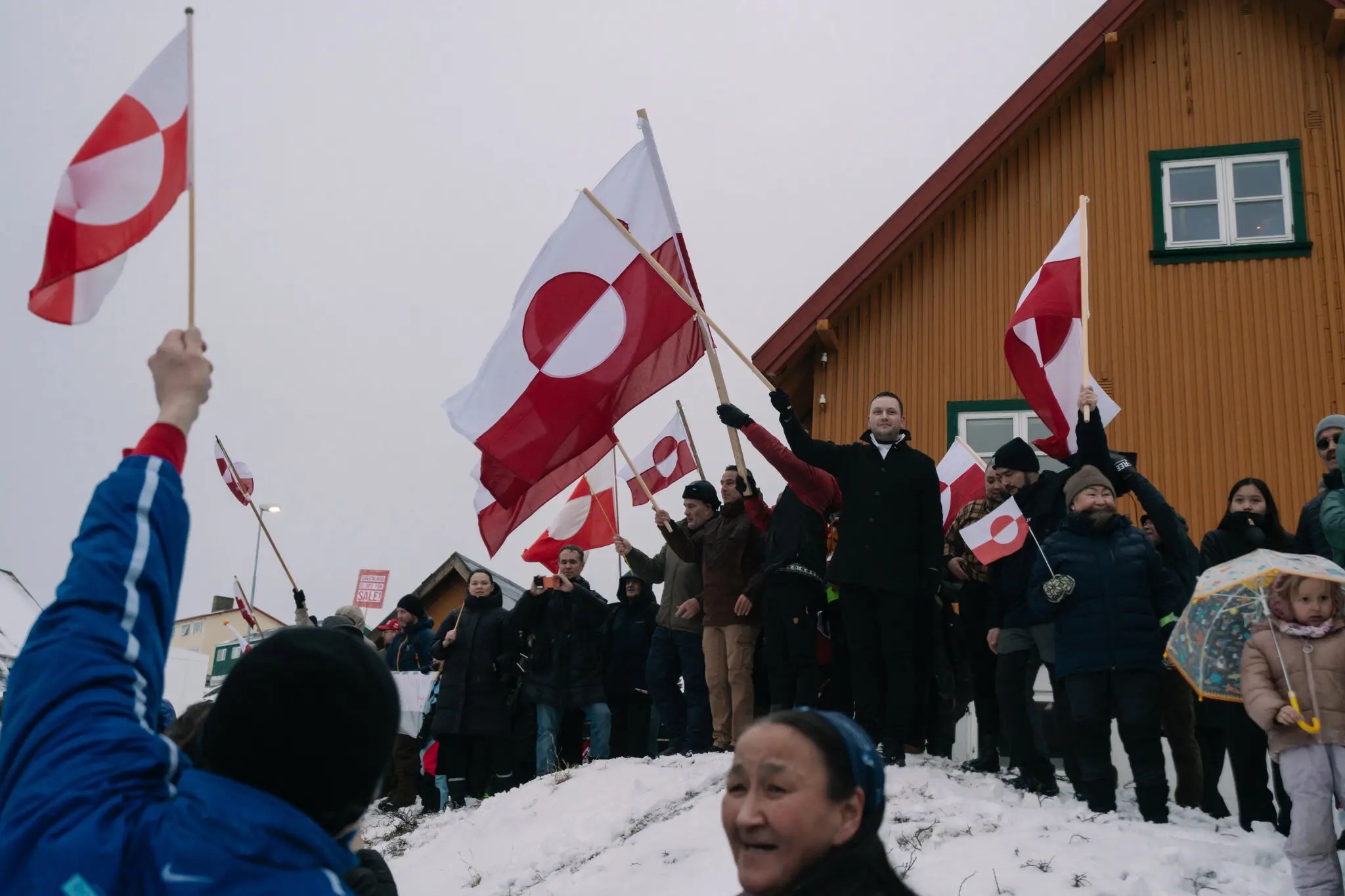 Above, the flag and coat of arms of Greenland. Below, the flag and coat of arms of Iceland.