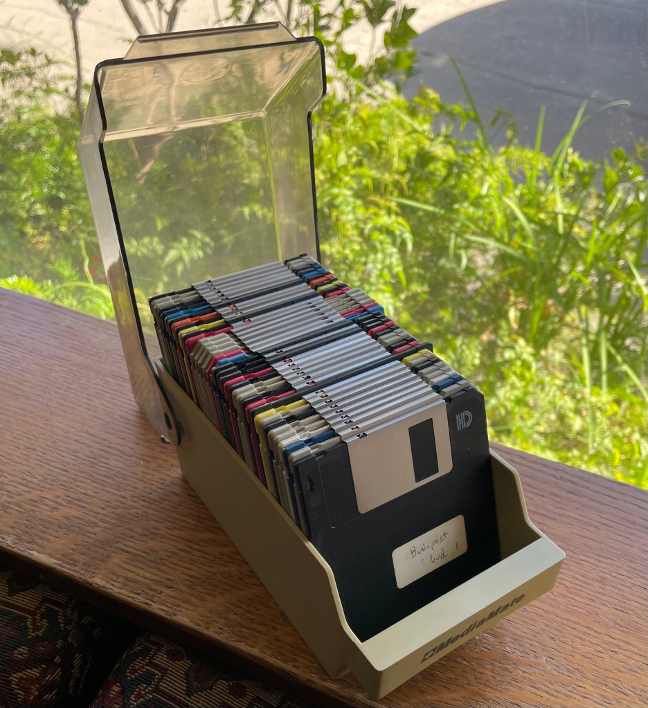 My collection of vintage-2000 floppies. One is hand-labeled “Budapest,” another, “Dellow1.TIF (DRAWING) Dellow2.TIF (4/c MkIIB).”
