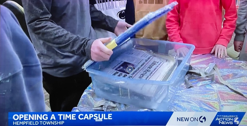 KELLY SASSO OF WTAE PITTSBURGH REPORTS “Western Pennsylvania Students Amazed By What’s Inside Time Capsule From 2000,” WTAE 4 ABC, January 8, 2026: “Students in the Hempfield Area School District had a chance to ‘time travel’ back to the year 2000 on Thursday.”
