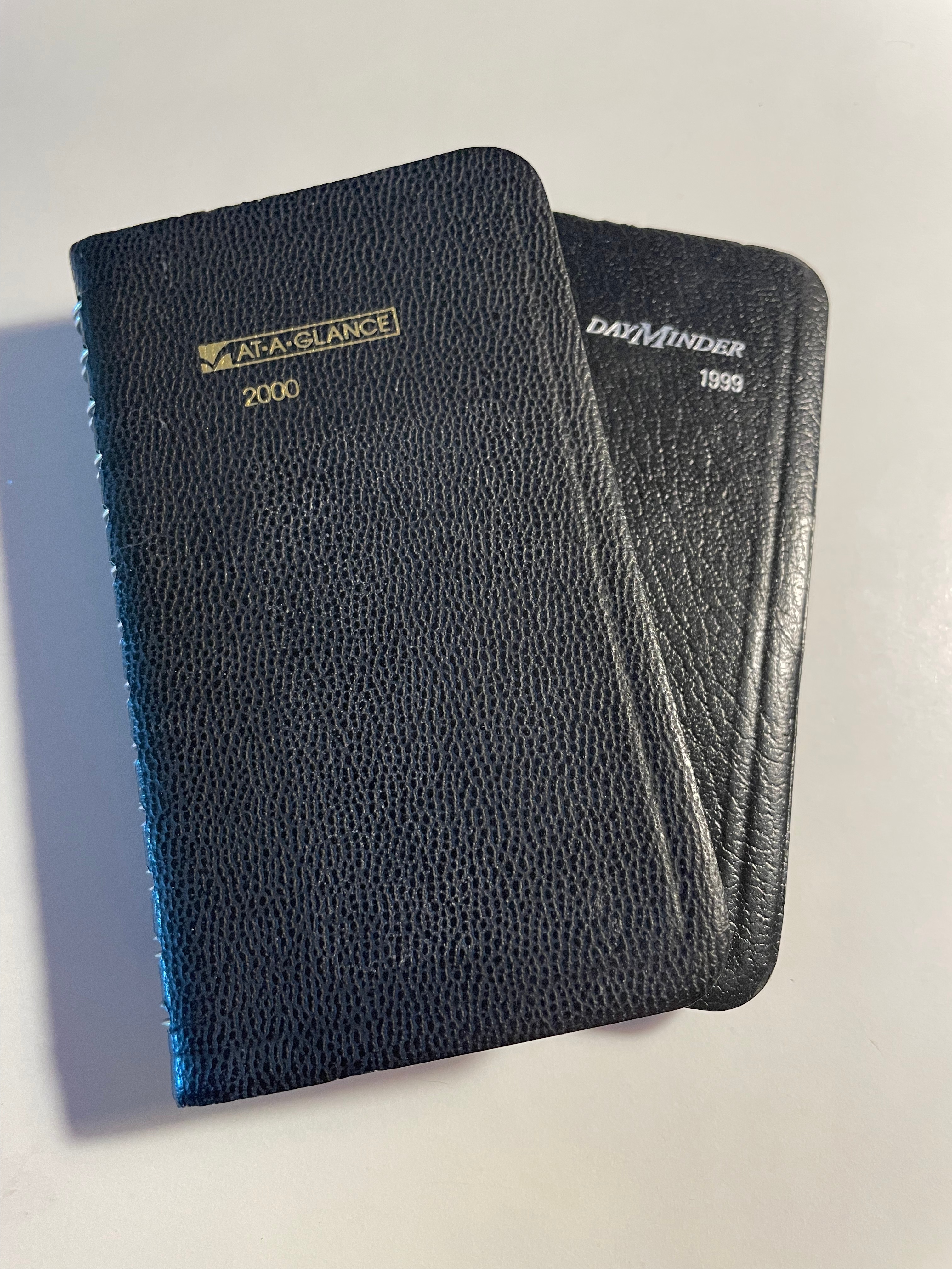 Contacts from “At-A-Glance 2000.” Penciled in at the front, before any expense records, are lots of interesting memorabilia: a phone number for the car Chunnel 7 a.m.-10 p.m. One for Healthy Lithuanian Restaurant on S. Halstead, Chicago. Daughter Suz’s Malibu number when she house-sat on the ocean. And a tantalizing one: a PO box and email address for Liz in Fiji.