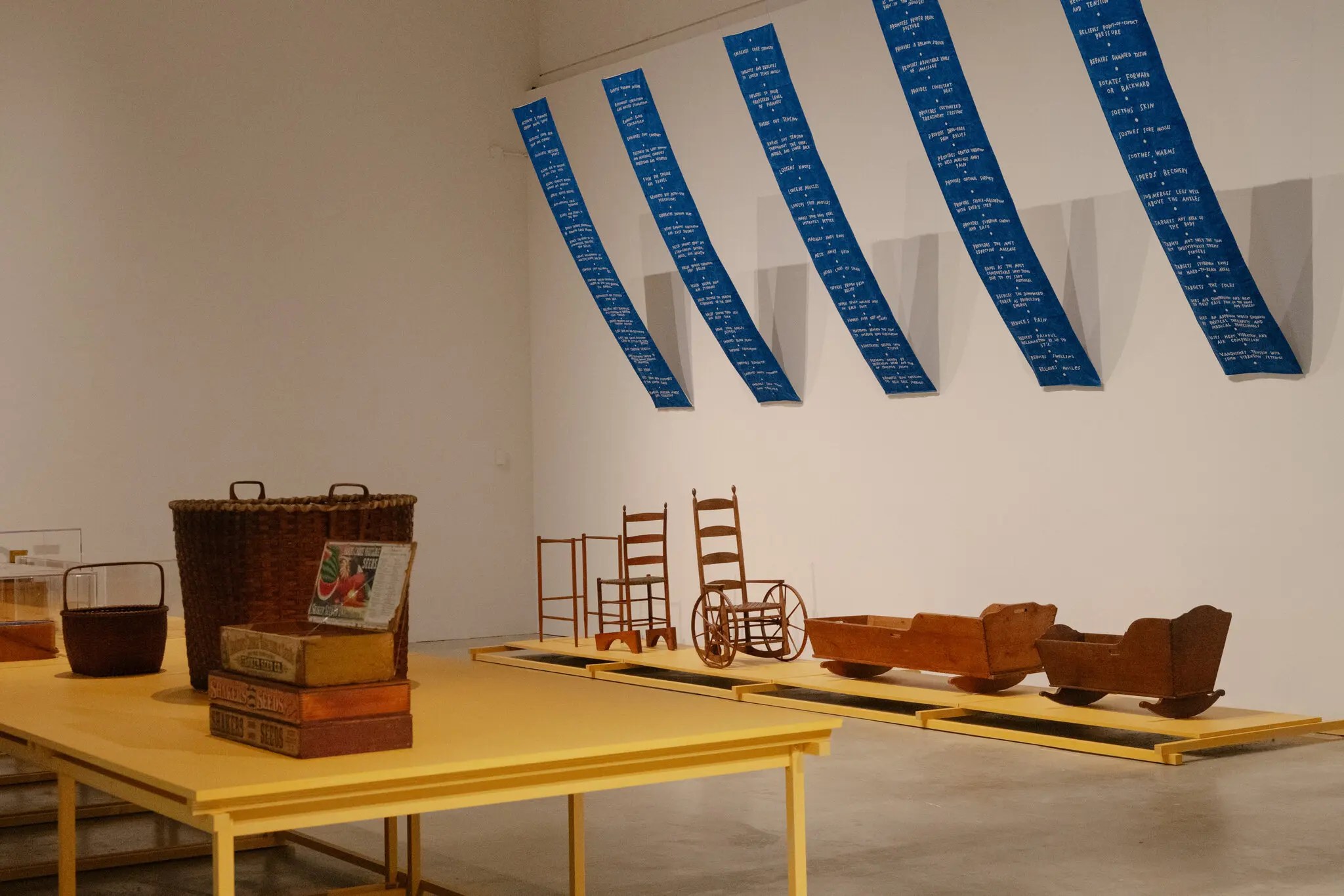 Lasky observes, “ ‘A World in the Making” includes two embroidered textiles designed by the artist Kameelah Janan Rasheed. The pieces refer abstractly to the writings of Jackson, who said that she learned to read in a swoop of divine intervention.”