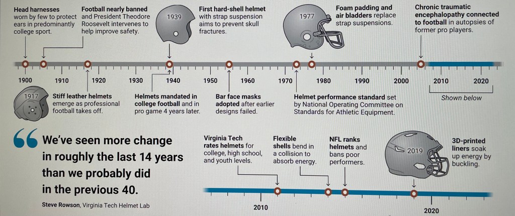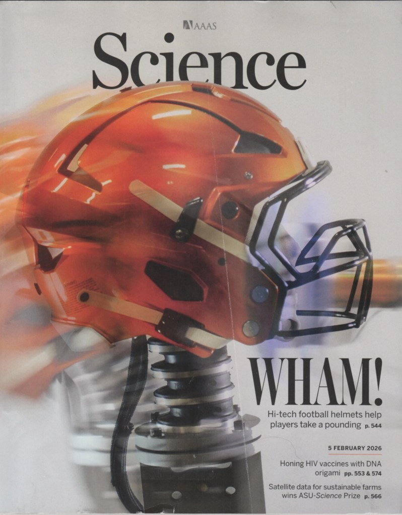 In “Softening The Blow,” AAAS Science, February 5, 2026, Adrian Cho describes, “Football helmets have improved dramatically in recent years. ‘We’ve seen more change in roughly the last 14 years than we probably did in the previous 40,’ says Steve Rowson, a biomedical engineer at Virginia Tech and director of the Virginia Tech Helmet Lab, the de facto rating body for football helmets used at college, high school, and youth levels. Ann Bailey Good, a mechanical engineer at Biocore, which tests helmets for the NFL, says, ‘From what we’ve seen in the lab, they’re definitely able to mitigate impacts much better than they could 5 or 10 years ago.’ ”