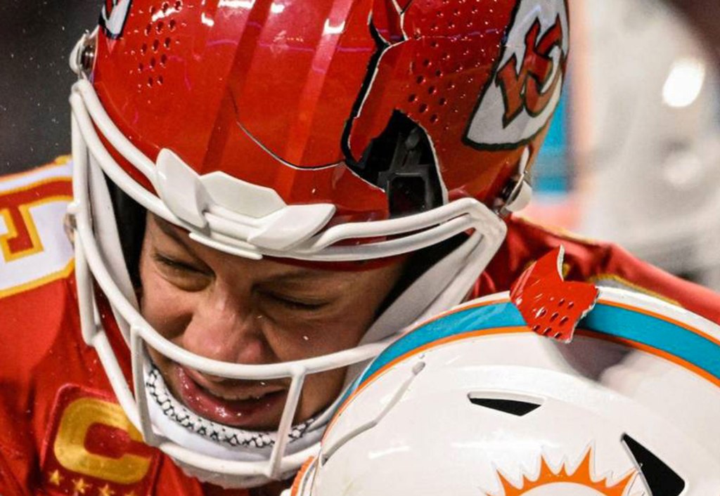 A blow to the head cracked the helmet of star quarterback Patrick Mahomes on a frigid day in January 2024, but it still kept him from harm. Image by Emily Curiel/The Kansas City Star via Zuma Press Wire.