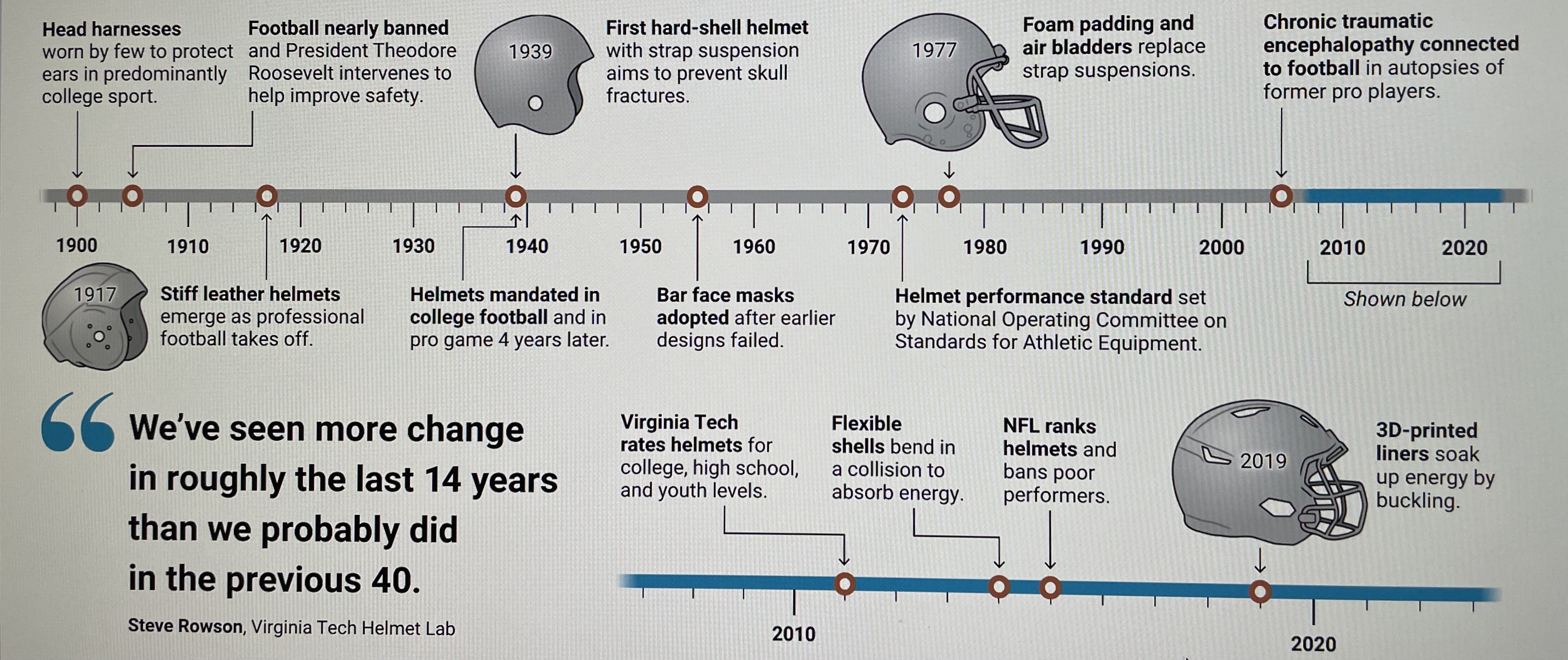 Concussions a Real Concern. Cho describes, “Innovation in helmets didn’t accelerate again until the 2000s, when concerns about concussions came to a crescendo. Autopsies revealed that numerous former NFL players who had exhibited behavioral and neurological problems suffered from the brain wasting of CTE. Countless parents worried whether it was safe to let their children play football, and calls arose to ban the game for youth.”