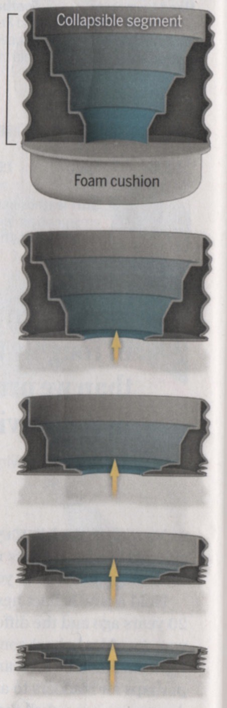 Each pillar provides controlled collapse, reducing the head’s acceleration on impact.