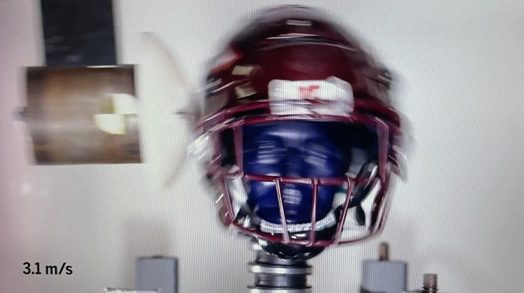 Cho describes, “In the high-speed video that Biocore takes of every test, the rounded plastic end of the ram burrows into the helmet and the mechanical neck snaps over. Instruments in the head measure linear and angular accelerations, and researchers rank helmets based on their ability to limit a measure of acceleration that correlates with concussion risk.”