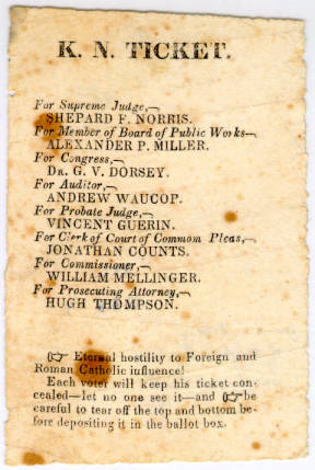 An 1855 Ohio Know Nothing Party ticket. At the bottom are voting instructions. Image from Wikipedia.